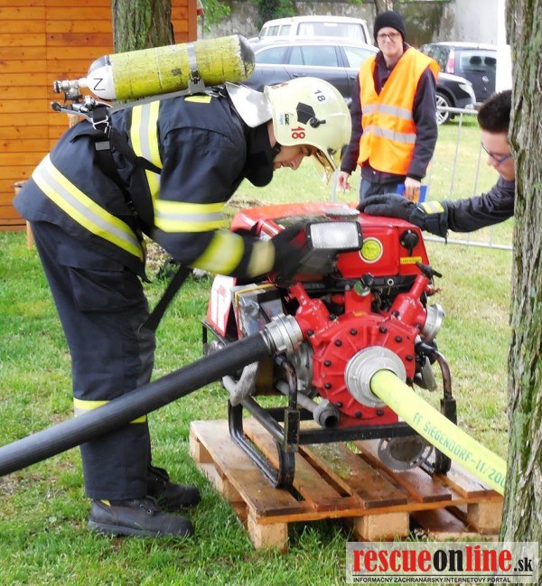 V druhej disciplíne museli hasiči na hasičskej striekačke pustiť vodu do hadíc kohútovým ventilom, rozvinúť ich a prúdom vody z prúdnice zraziť terčík. Následne súťažiaci hadicu naplnenú vodou dotiahli späť a prúdnicu uložili späť do dreveného boxu.