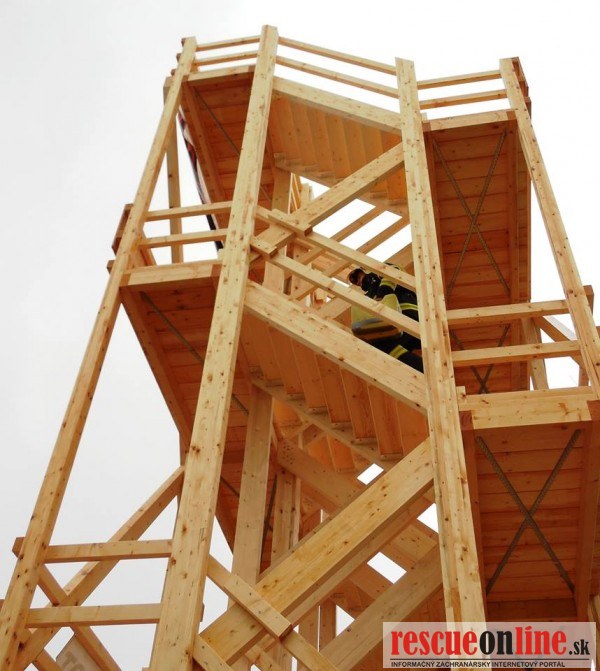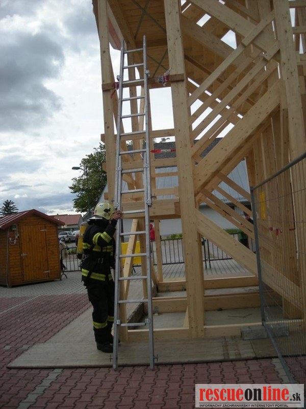 V tretej disciplíne museli hasiči preniesť hasičský rebrík a oprieť ho o konštrukciu drevenej veže. Ich úlohou potom bolo vyniesť v rukách dvakrát 15 kilogramovú záťaž po dvojramenných drevených schodoch až na plošinu veže. Trasa merala približne 12, 5 metra. Na veži museli hasiči vytiahnuť pomocou lana zo zeme dve hadice typu „B“. Následne hadicu zniesli po schodoch dole a uložili na vyznačené miesto. Súťažnú disciplínu ukončili presunutím hasičského rebríka na jeho pôvodné miesto a po montáži hubice na prúdnicu, dobehli do cieľa.