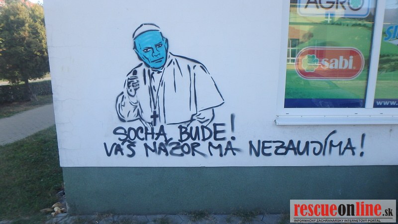 KRPZ Prešov |MM| Na jednej zo stien obchodného domu na Ul. Hviezdoslavovej v Snine doposiaľ neznámy páchateľ sprejom nastriekal portrét pripomínajúci pápeža.