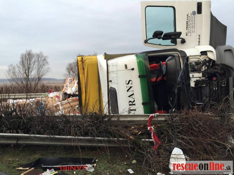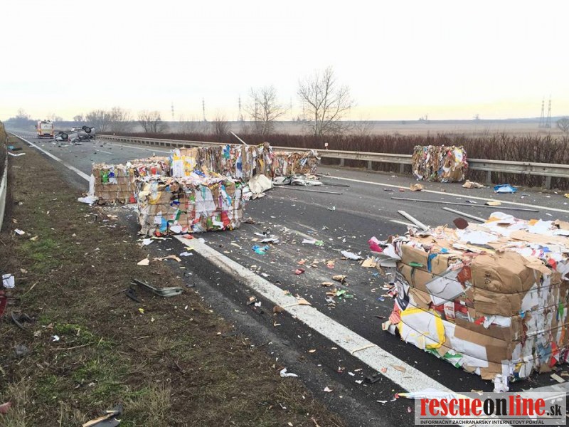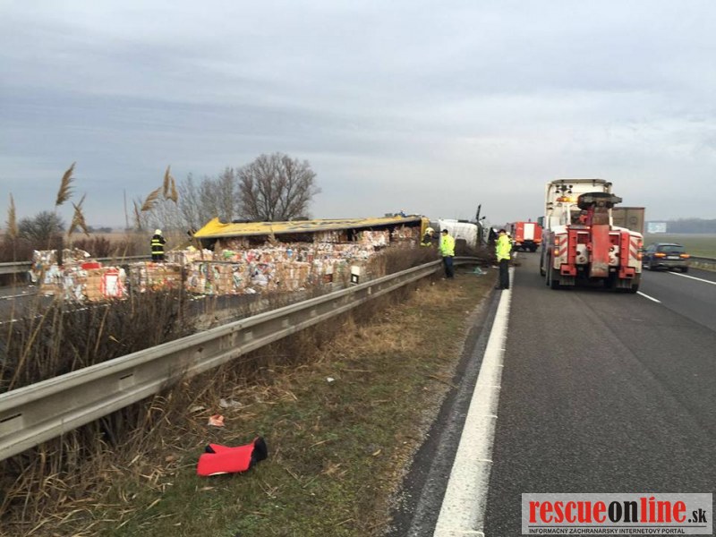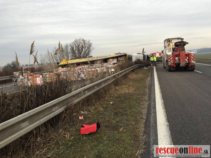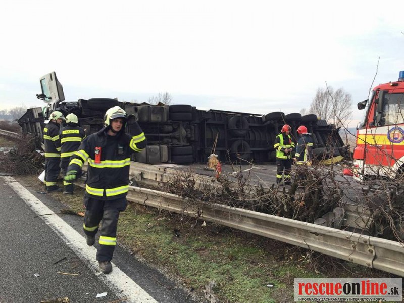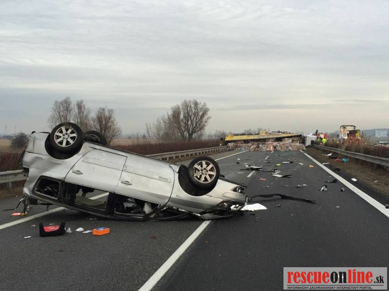 Dnes krátko pred pol siedmou ráno bola ohlásená dopravná nehoda nákladného vozidla na diaľnici D2 v smere z Lozorna do Bratislavy. Po príchode hasičov na miesto udalosti bolo zistené, že ide o prevrátený kamión na boku a osobné motorové vozidlo na streche, pričom kamión blokuje oba jazdné pruhy diaľnice. Následkom dopravnej nehody sa zranili tri osoby, jedna osoba nehodu neprežila.