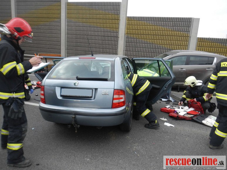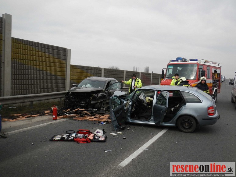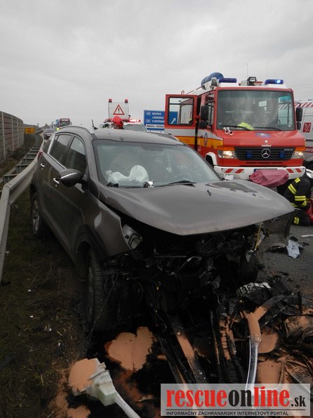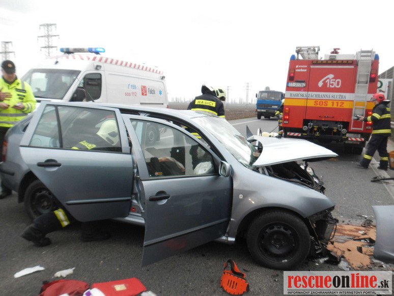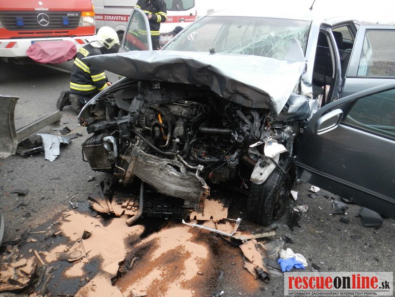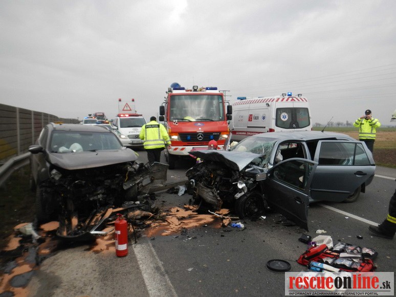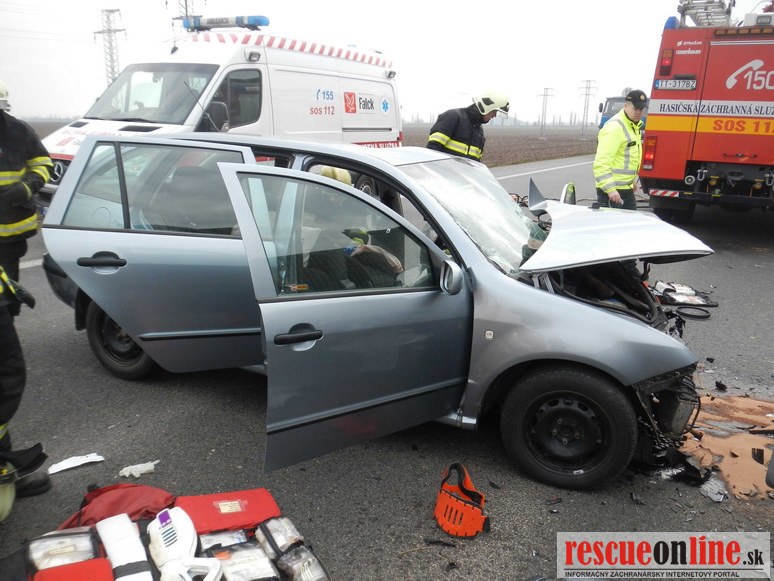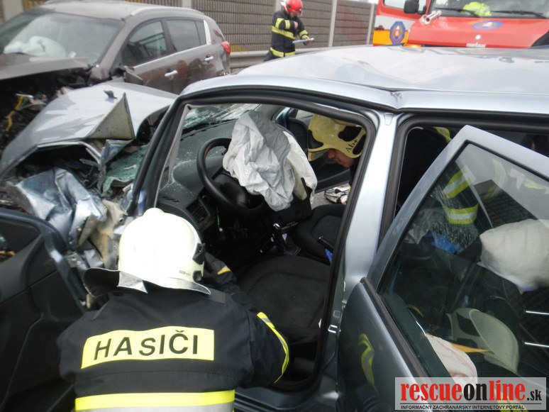 KR HaZZ Trnava |MM| Dňa 25. februára 2014 približne o 09.45 hod. bola ohlásená dopravná nehoda dvoch osobných motorových vozidiel značky Kia Sportage a Škoda Fabia na ceste č. I/51 v obci Trnava (obchvat). Pri čelnej zrážke motorových vozidiel utrpeli zranenia dve osoby (vodiči vozidiel, iné osoby sa vo vozidlách nenachádzali), ktoré zasahujúci hasiči museli z vrakov havarovaných vozidiel vyslobodiť. Osobám následne poskytli predlekársku prvú pomoc a odovzdali ich do starostlivosti zdravotníkom Záchrannej zdravotnej služby. Hasiči vykonali na vozidlách protipožiarne opatrenia a zachytili uniknuté prevádzkové kvapaliny. Počas zásahu bola cestná komunikácia uzavretá v oboch smeroch a premávku riadila Polícia.