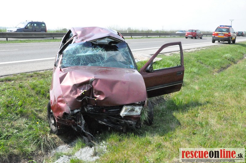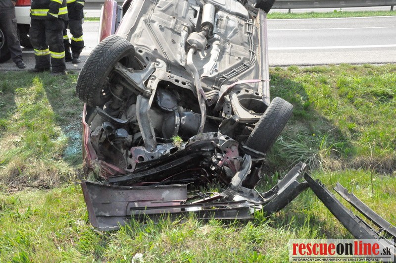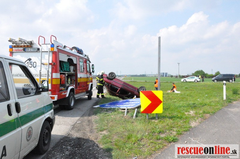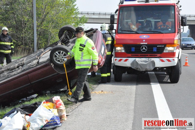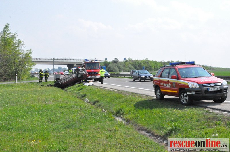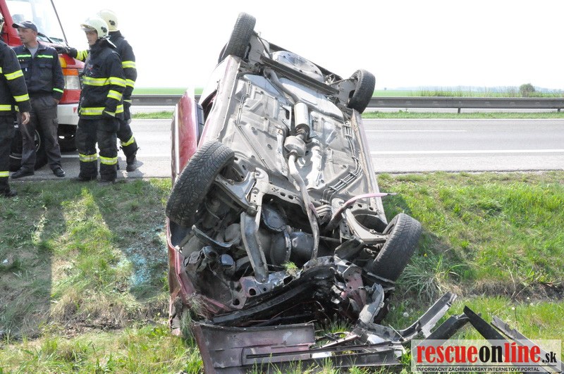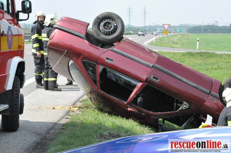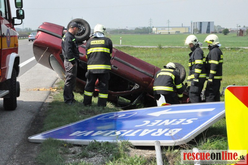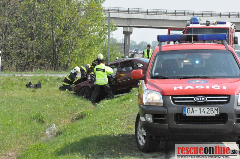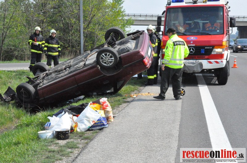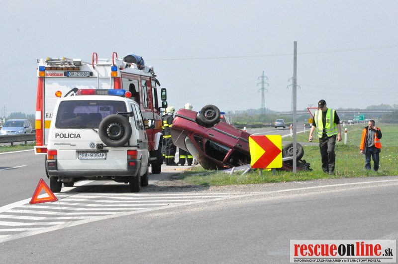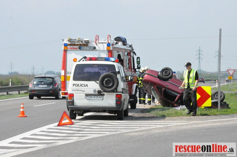 Sereď | R1 | Asi o 14. hodine popoludní bola na tiesňovú linku HaZZ v Galante nahlásená dopravná nehoda na R1 za Sereďou (za Milexom). Do dopravného značenia narazilo a tabuľu vyvalilo osobné motorové vozidlo, ktoré po náraze skončilo mimo vozovku a na streche. Na miesto udalosti bola vyslaná jednotka HaZZ zo Serede, vozidlo RZP s osádkou a dopravná polícia. Miesto nehody zabezpečovalo viacej hliadok PZ. Zranená osoba bola sanitným vozidlom odvezená do nemocnice. Vo vozidle sa nachádzali aj dvaja psi, ktorí vyviazli bez zranení. Polícia príčiny dopravnej nehody vyšetruje. Premávka na R1 v smere z Nitry do Trnavy bola po dobu odstraňovania následkov nehody obmedzená čiastočne.
