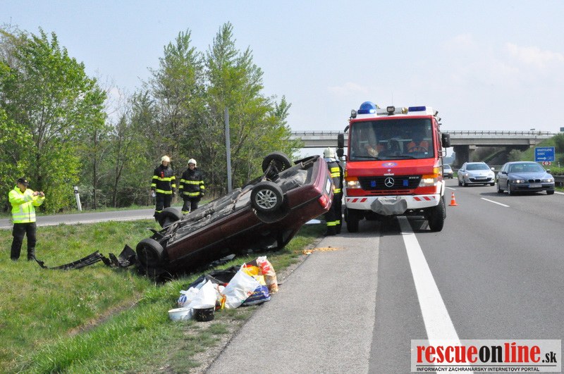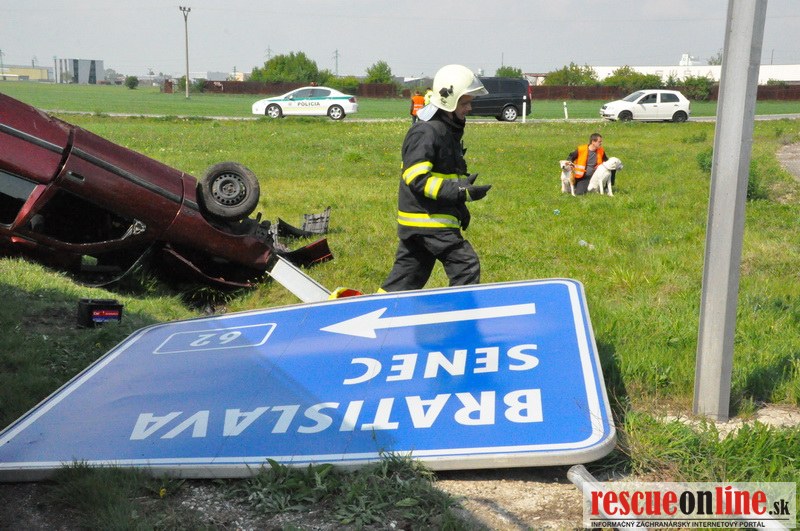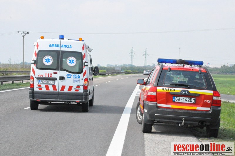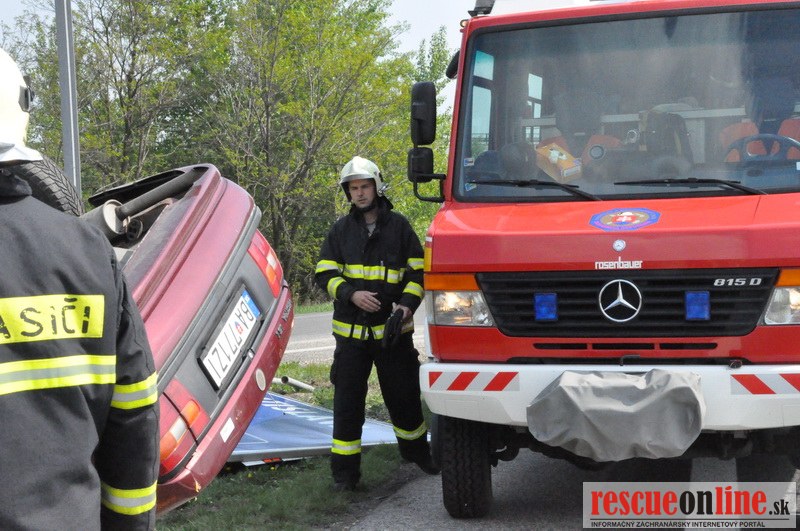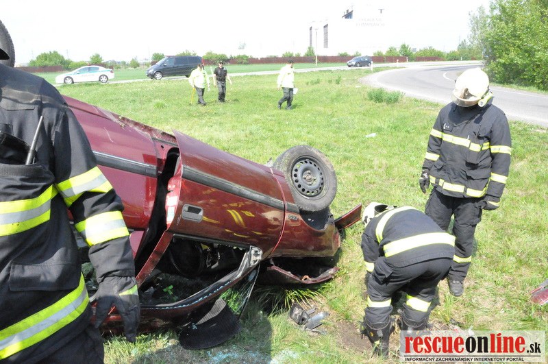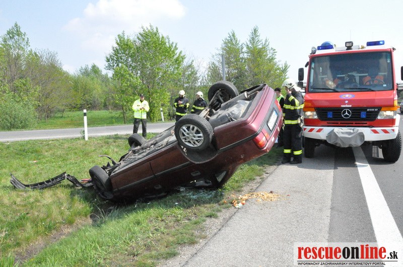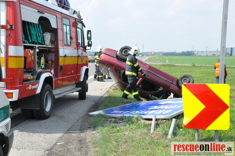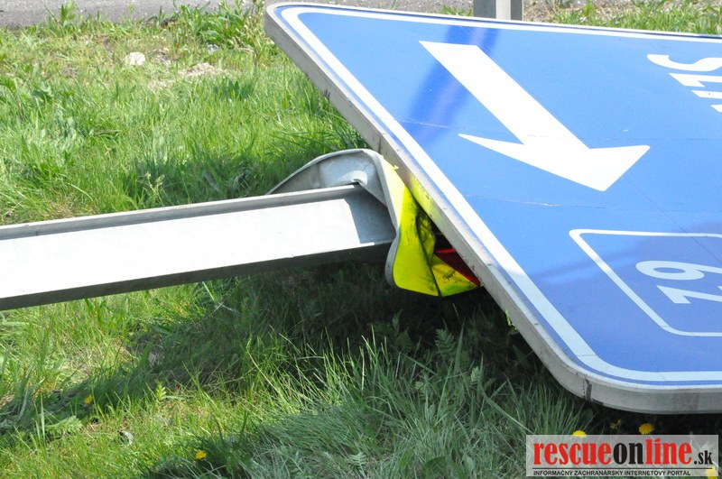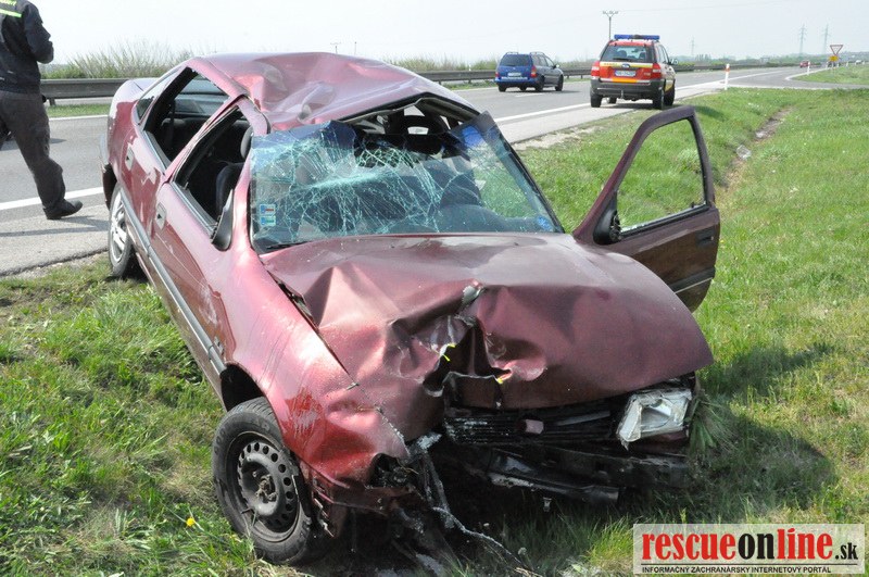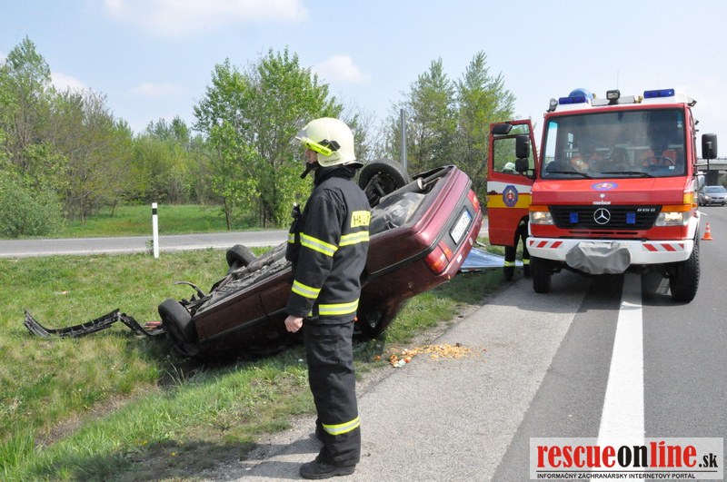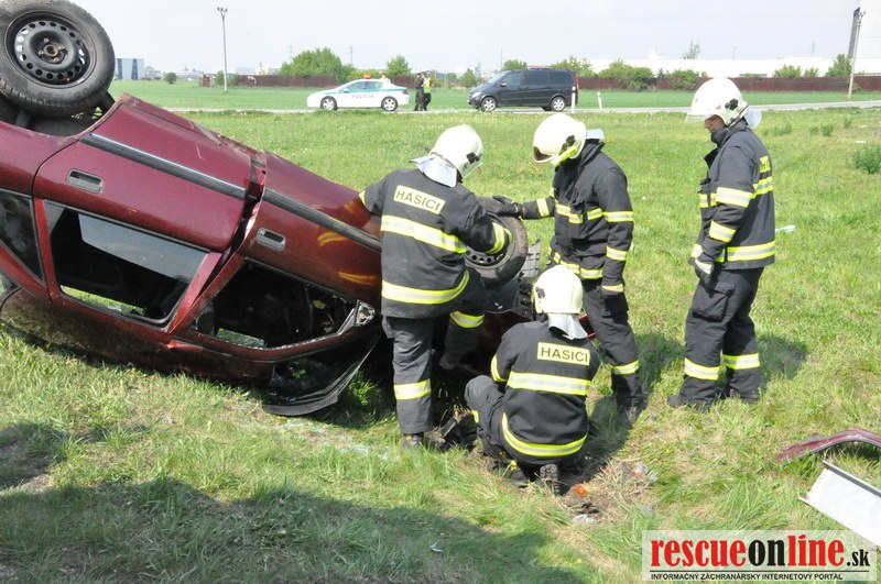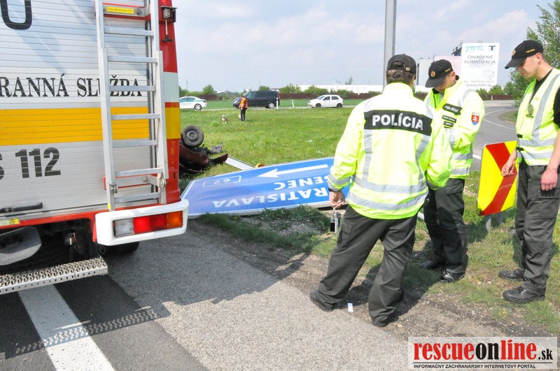 Sereď | R1 | Asi o 14. hodine popoludní bola na tiesňovú linku HaZZ v Galante nahlásená dopravná nehoda na R1 za Sereďou (za Milexom). Do dopravného značenia narazilo a tabuľu vyvalilo osobné motorové vozidlo, ktoré po náraze skončilo mimo vozovku a na streche. Na miesto udalosti bola vyslaná jednotka HaZZ zo Serede, vozidlo RZP s osádkou a dopravná polícia. Miesto nehody zabezpečovalo viacej hliadok PZ. Zranená osoba bola sanitným vozidlom odvezená do nemocnice. Vo vozidle sa nachádzali aj dvaja psi, ktorí vyviazli bez zranení. Polícia príčiny dopravnej nehody vyšetruje. Premávka na R1 v smere z Nitry do Trnavy bola po dobu odstraňovania následkov nehody obmedzená čiastočne.