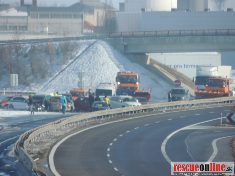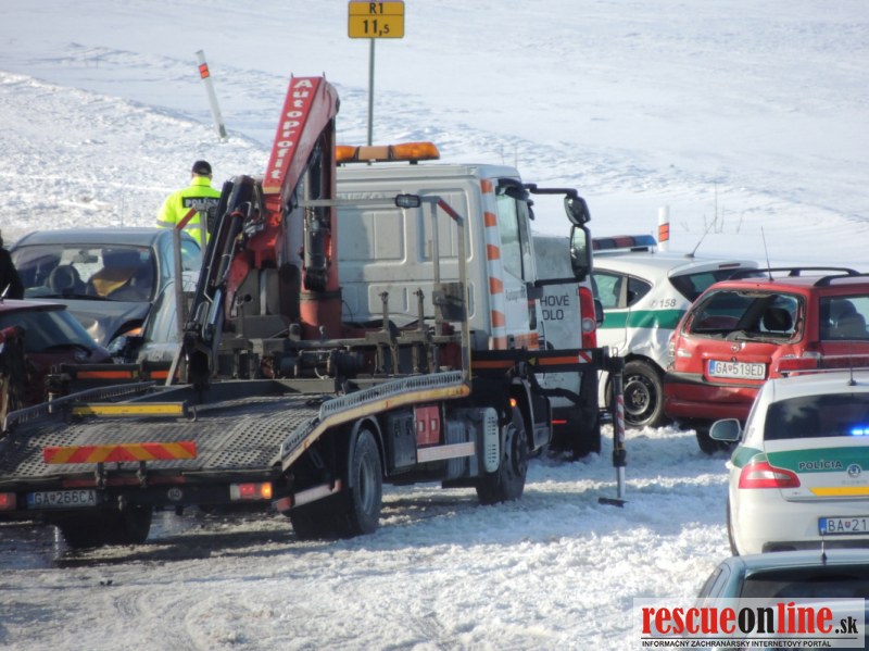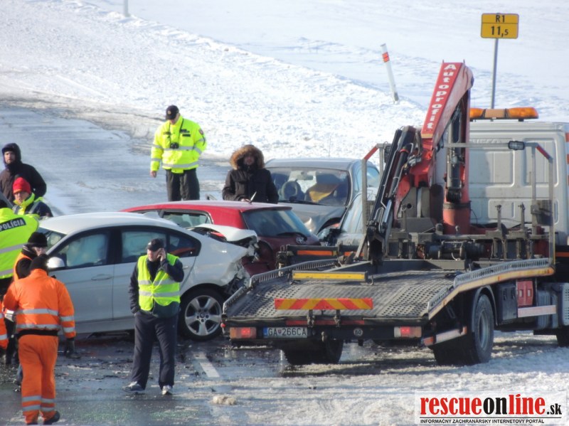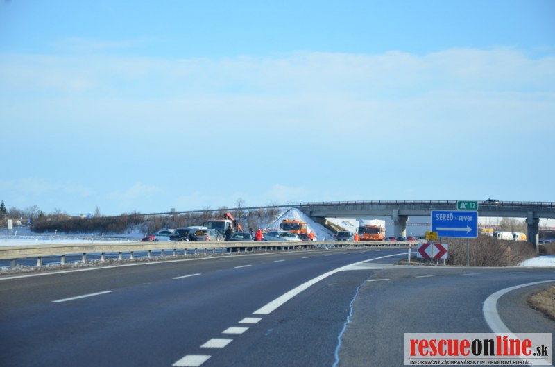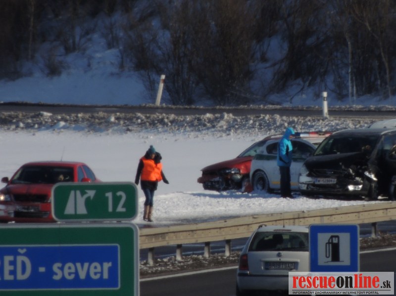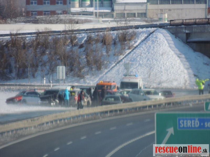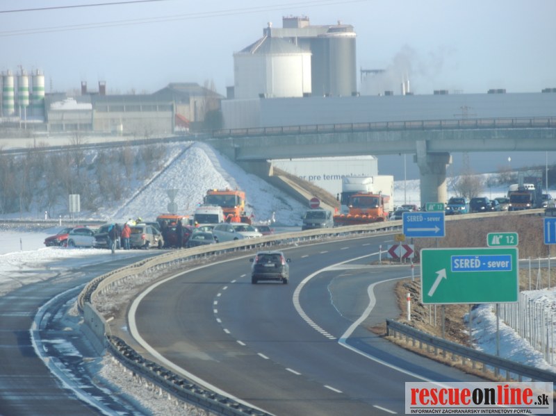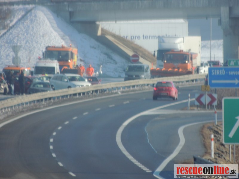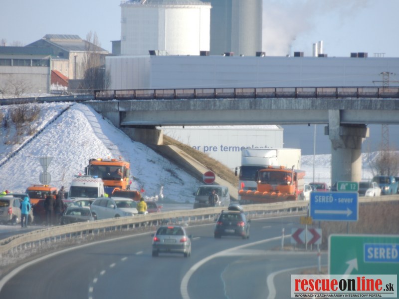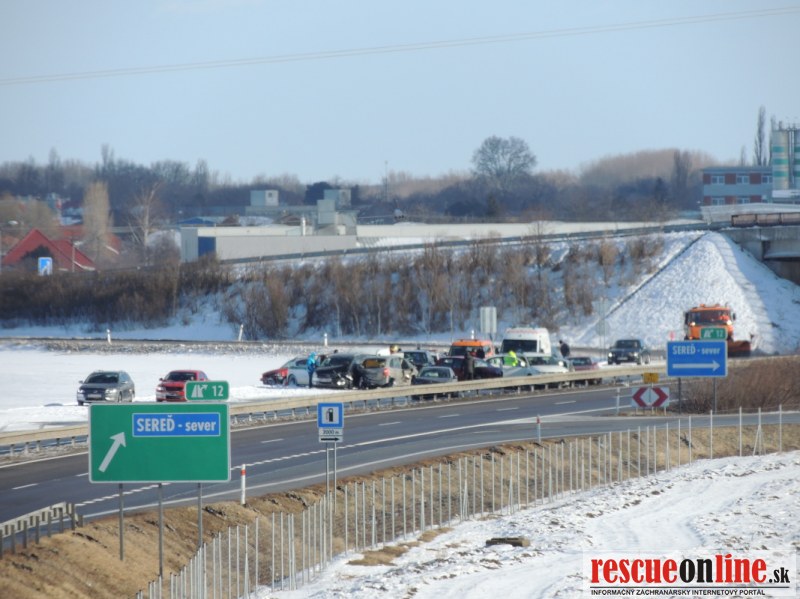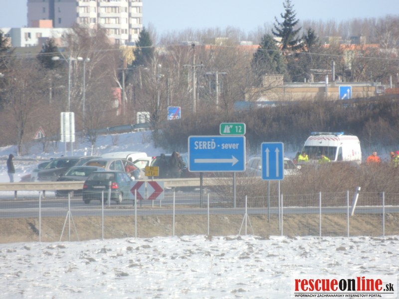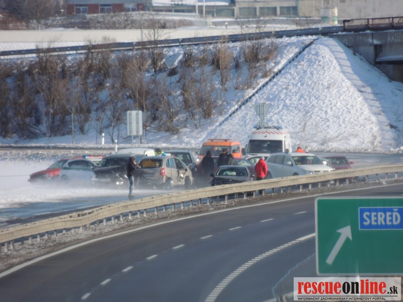 Sereď | Na výjazde z mesta Sereď v pripájacom pruhu na R1 v smere do Trnavy došlo k vážnej dopravnej nehode. Mimo vozovky a vo zvodidlách skončilo niekoľko osobných áut, ktoré pravdepodobne nezvládli prejazd zle upraveným povrchom pripájacieho pruhu resp. rýchlostnej komunikácie R1. Zo strany rolí fúka silný vietor, ktorý vytvára na ceste nepravidelnú snehovú pokrývku, snehové jazyky a záveje. Na mieste v súčasnej dobe zasahujú záchranári a predmetnú časť komunikácie prišlo upraviť niekoľko odhrňačov správcu komunikácie.