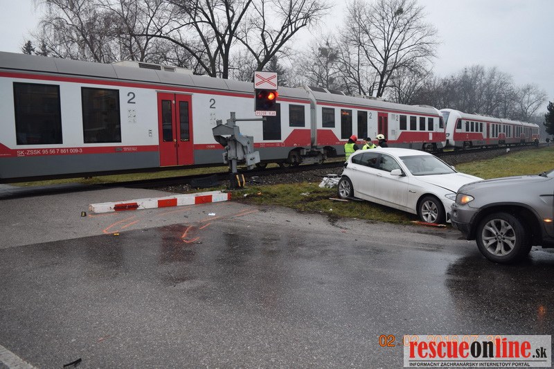ŽSR |MM| Dnes ráno, t.j. 2. februára 2016 o 7.00 hod došlo na zabezpečenom železničnom priecestí v Partizánskom k zrážke osobného vlaku s osobným autom BMW. Pri nehode nedošlo k žiadnym zraneniam ani úmrtiu účastníkov nehody. Vodičke sa pred prichádzajúcim vlakom podarilo z auta vyskočiť. Na priecestí bolo po nehode zlomené jedno rahno závor.
