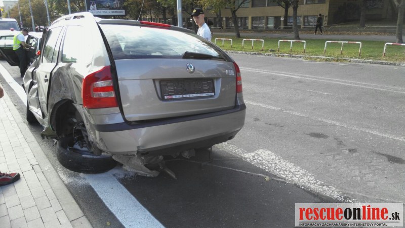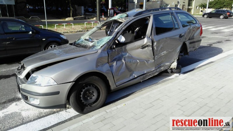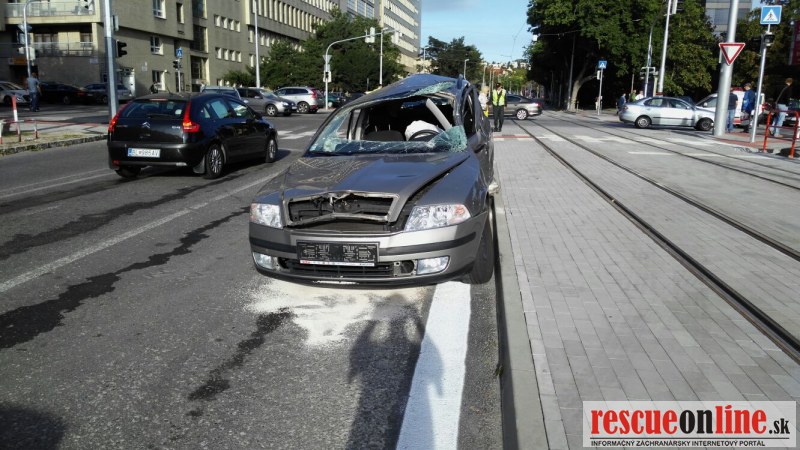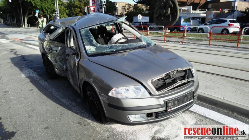 Odťahovka Jaslovský |MM| Bratislava | Dnes v doobedných hodinách došlo v centre Bratislavy k dopravnej nehode. Octávia išla od stanice po ul. Imricha Karvaša a jej vodič mal snahu odbočiť v ľavo na Mýtnu ul. Električka idúca tiež z toho istého smeru mu to znemožnila. Obaja vodiči sa cítia bez viny. Tvrdia že mali na signalizácií voľno. Vinu určí správny orgán. Vodiča Octávie odviezla na vyšetrenie do nemocnice sanitka. Bol pri vedomí a sústredene komunikoval.