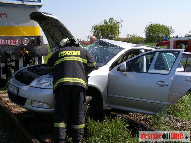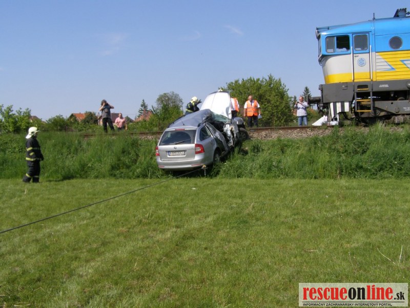 KR HaZZ Trnava | Na operačné stredisko KR HaZZ v Trnave bola ohlásená v pondelok 2. mája 2011 o 14:08 hod. dopravná nehoda osobného motorového vozidla a vlakovej súpravy na nechránenom železničnom priecestí št. cesty č. III/063030 a trate Bratislava – Komárno. K udalosti bol vykonaný výjazd štyroch príslušníkov s technikou MB Atego. Po príjazde na miesto udalosti bolo zistené, že na železničnom priecestí došlo k zrážke os. mot. vozidla Škoda Octavia s osobným vlakom. Pri zrážke došlo k zraneniu dvoch osôb, vodičky a spolucestujúcej. Jedna osoba ostala zakliesnená vo vraku osobného motorového vozidla. Táto osoba bola z vozidla vystrihnutá hydraulickým vyslobodzovacím náradím, príslušníkmi HaZZ. Prostredníctvom KS IZS Trnava na miesto nehody bola vyslaná posádka vrtuľníkovej záchrannej zdravotnej služby, avšak po pristaní na mieste nehody lekárom bolo skonštatované, že rozsah zranení postihnutých osôb neodôvodňuje prevoz s vrtuľníkom a preto zranené osoby boli transportované sanitkou ZZS. Cestujúci vo vlaku zranení neboli. Vlaková súprava nebola poškodená a po obhliadke miesta nehody príslušníkom polície pokračovala v jazde. Príslušníkmi HaZZ bolo vykonané protipožiarne zabezpečenie havarovaného vozidla a zabezpečenie proti uniku prevádzkových kvapalín.