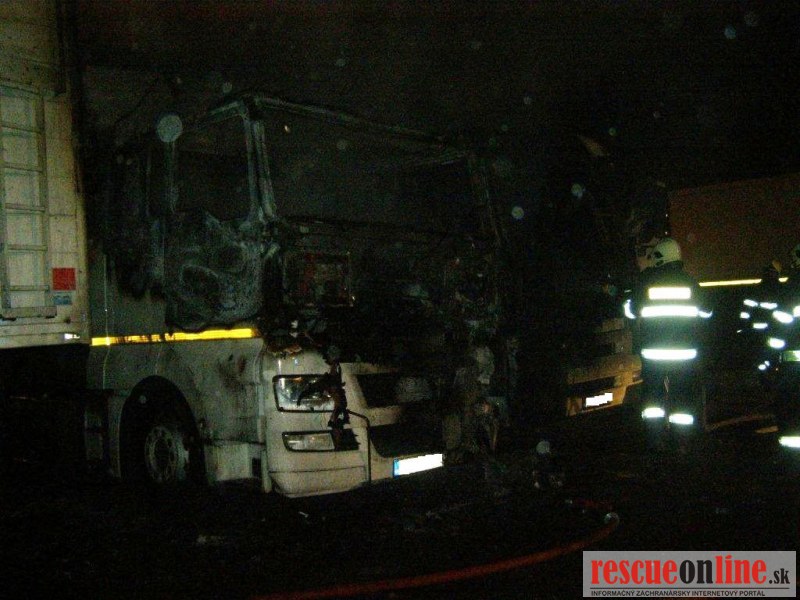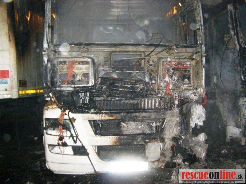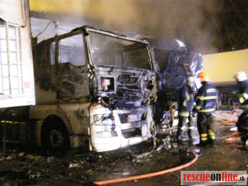 KR HaZZ Trnava |MM| Na ohlasovňu požiarov OR HaZZ v Dunajskej Strede bol dňa 2.1.2013 o 03:20 hod. nahlásený prostredníctvom KS IZS v Trnave požiar nákladných vozidiel, odstavených na parkovisku spoločnosti na Medveďovskej ceste v Gabčíkove (okres Dunajská Streda). Na miesto udalosti boli vyslaní 10 príslušníci z hasičských staníc v Dunajskej Strede a vo Veľkom Mederi s technikou CAS 30 IVECO TRAKKER, MB ATEGO a CAS 32 TATRA T-815. Po príchode na miesto udalosti bolo prieskumom zistené, že sa jedná o požiar 4 kamiónov (ťahačov – 2xMAN, 2xVOLVO) a troch návesov, ktoré boli v čase príjazdu hasičských jednotiek celé zachvátené plameňom. Vedľa zasiahnutých vozidiel sa nachádzali ďalšie dva kamióny, ktoré príslušníci HaZZ včas odtiahli do bezpečia. Na miesto udalosti sa dostavili aj 5 členovia OHZ Gabčíkovo s technikou CAS 25 Š706. Na lokalizáciu a likvidáciu vzniknutého požiaru boli nasadené 3 „C“ prúdy a 2 vysokotlakové prúdy za používania autonómnych dýchacích prístrojov z dôvodu silného zadymenia. Pri prieskumoch bola používaná termovízna kamera a na osvetlenie miesta udalosti osvetľovací agregát. Na miesto udalosti sa dostavili príslušníci PZ SR. Po zbalení vecných prostriedkov a zdokumentovaní udalosti začali o 05:48 hod. hasičské jednotky odchádzať na svoje základne. Následkom požiaru vznikla spoločnosti priama materiálna škoda predbežne vyčíslená na 300.000,- €. Pravdepodobnou príčinou vzniku požiaru bolo úmyselné zapálenie.