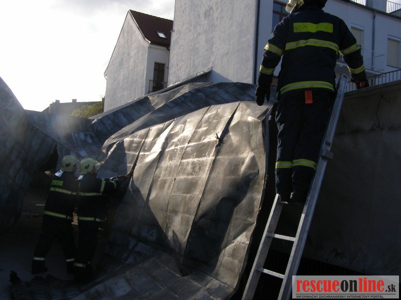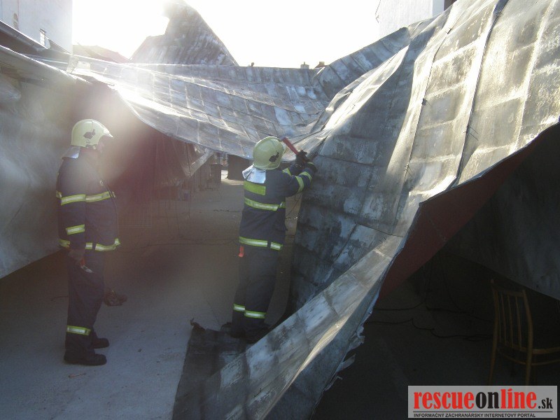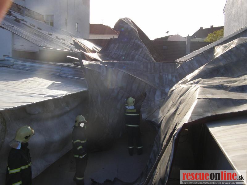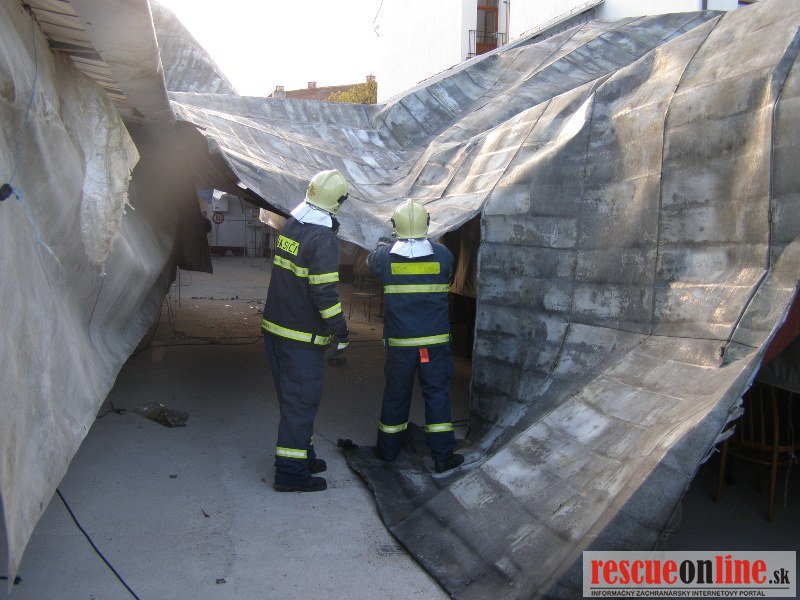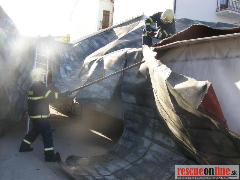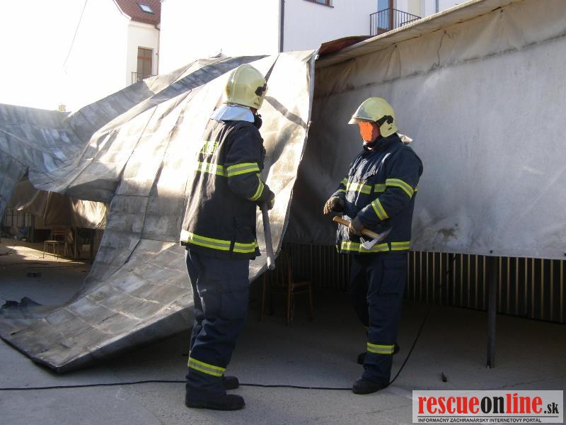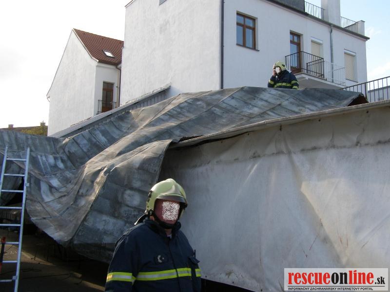 Piešťany | KR HaZZ Trnava | Na operačné stredisko OR HaZZ v Piešťanoch bola v sobotu 9. apríla 2011 o 07:07 hod. prostredníctvom linky 112 nahlásená odtrhnutá strecha na objekte Univerzity sv. Cyrila a Metoda na Rázusovej ulici v Piešťanoch. Na miesto udalosti boli vyslaní traja príslušníci HaZZ s technikou AHZS MB Atego. Po príjazde na miesto udalosti bolo prieskumom zistené, že vplyvom vetra bola odtrhnutá strecha 35x16m z budovy, ktorá bola odviata do priestorov mestskej tržnice, kde bola zachytená na provizórnych konštrukciách predajných stánkov. Príslušníci HaZZ okolie zabezpečili a prekontrolovali. VZ si na miesto udalosti vyžiadal Mestskú Políciu Piešťany, ktorá sa dostavila a zabezpečila nežiaduci vstup osôb na miesto udalosti. Príslušníci HaZZ na odstránenie a zabezpečenie zachytenej strešnej krytiny použili búracie náradie a krytinu po rozdelení bezpečne uložili v priestoroch tržnice, odkiaľ konštrukciu odstránia pracovnici Technických služieb Piešťany. Veliteľ zásahu si vyžiadal na miesto udalosti ťažké búracie sekery. Zasahujúci príslušníci sa presunuli na strechu posluchárne, kde sa nachádzal ďalší kus odtrhnutej strešnej krytiny, ktorú príslušníci odstránili a bezpečne uložili na nádvorí objektu. Po ukončení zásahu sa jednotka o 09:37 hod. vrátila na základňu.
