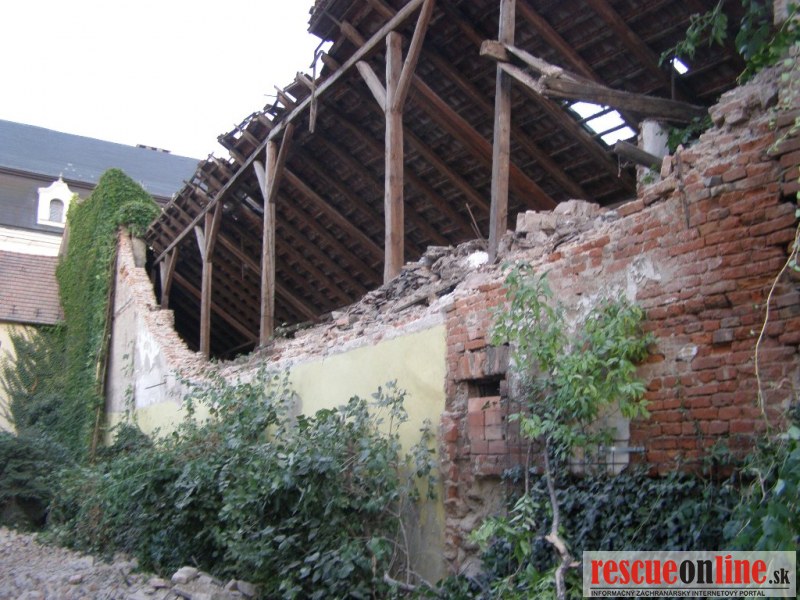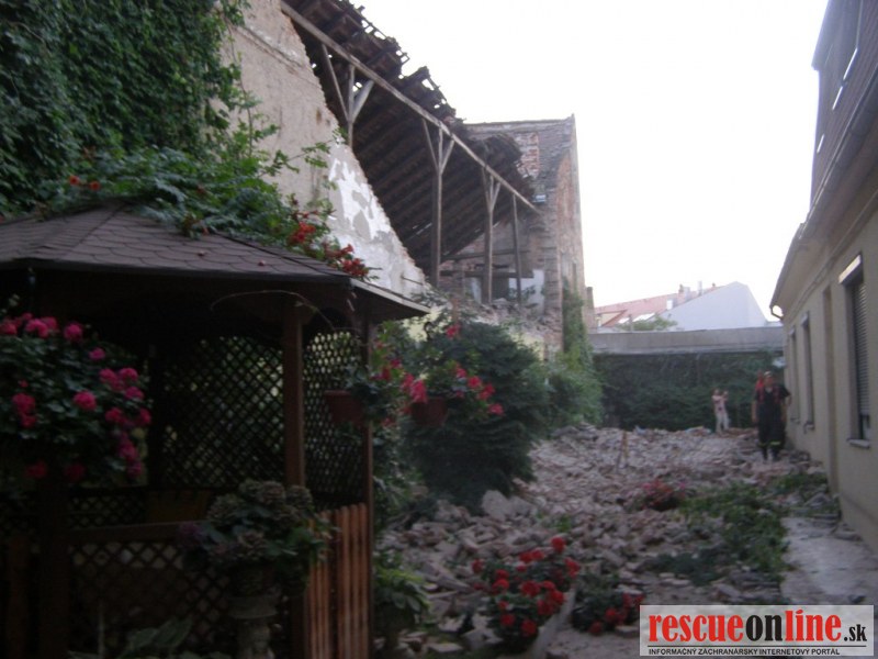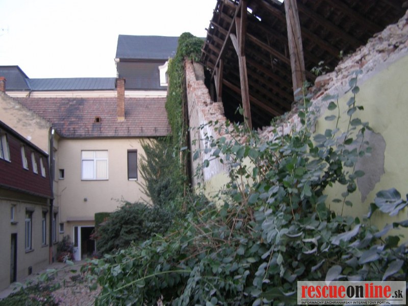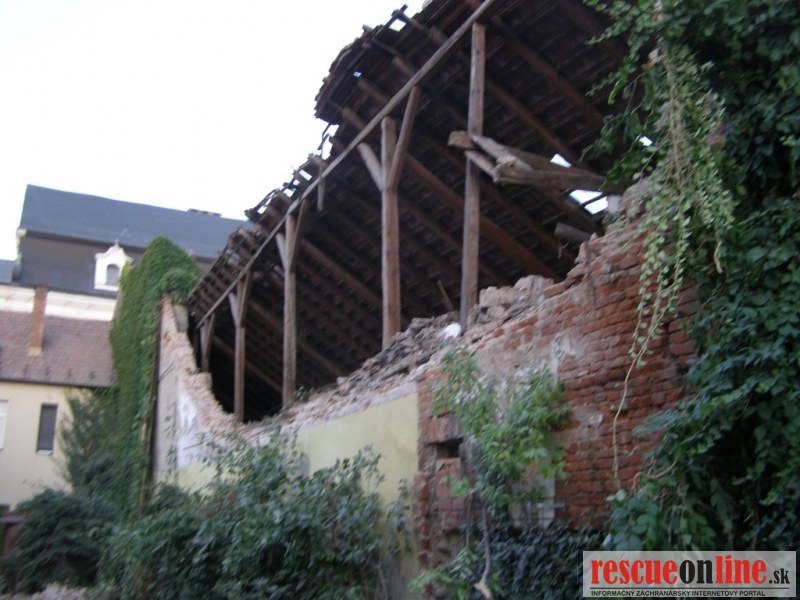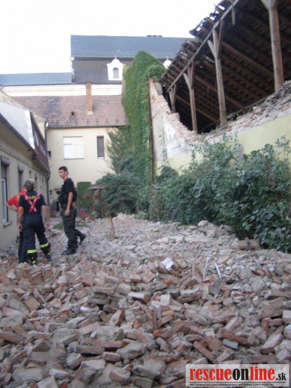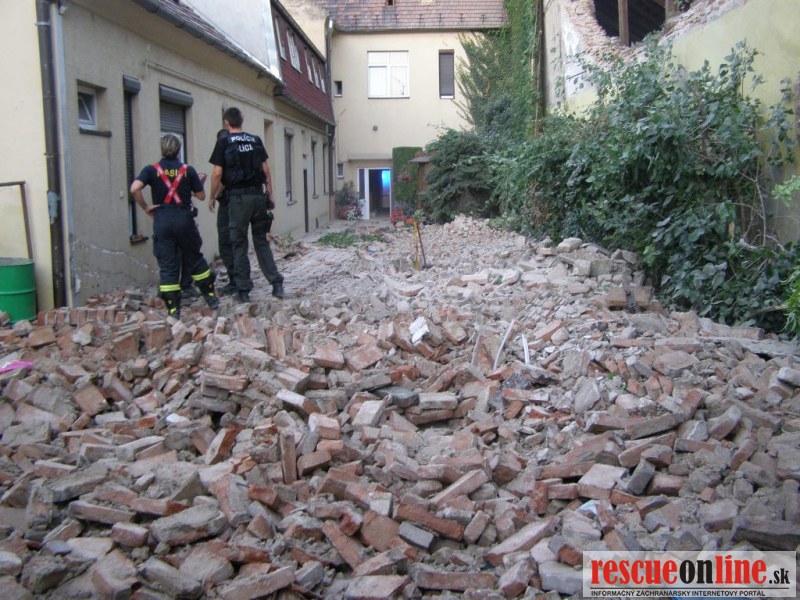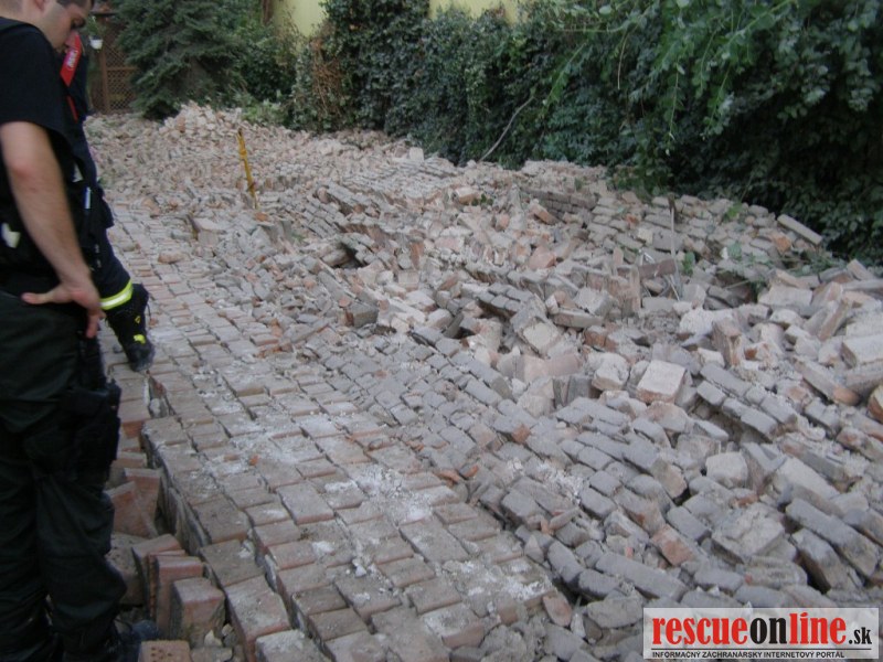 KR HaZZ Trnava |MM| Na operačné stredisko OR HaZZ v Trnave bola v stredu 24. augusta 2011 o 19:12 hod. nahlásená cez KS IZS Trnava spadnutá časť múru neobývaného rodinného domu na Hollého ul. v Trnave. Na miesto udalosti boli vyslaní traja príslušníci HaZZ s hasičskou technikou Nissan Navara. Po príjazde na miesto udalosti bolo zistené, že došlo k zrúteniu múru neobývaného domu o rozmeroch cca 15 x 10 metrov do dvora rodinného domu. Súčasne s príchodom jednotky HaZZ sa na miesto udalosti dostavili príslušníci PZ Trnava. K zraneniu osôb nedošlo. Pretože hrozil pád zvyšnej časti múru bolo potrebné evakuovať osoby zo susediaceho rodinného domu, do ktorého dvora sa zrútil múr. Príslušníci HaZZ evakuovali sedem osôb /4 dospelé a 3 deti/. Veliteľ zásahu si na miesto udalosti vyžiadal ďalšiu techniku. Na miesto udalosti bola vyslaná jednotka o počte dvaja príslušníci s hasičskou technikou MB Vario. Na miesto udalosti bola vyžiadaná Mestská polícia, ktorá sa na miesto dostavila súčasne s náčelníkom MsP. Príslušníci HaZZ odpojili susediaci dom od prívodu el. energie a plynu. Po obhliadke miesta udalosti statikom mesta a konzultácii s primátorom mesta bolo rozhodnuté, že v ďalších prácach na odstránení následkov pádu časti múru sa bude pokračovať nasledujúci deň. Miesto udalosti bolo odovzdané MsP Trnava, ktorá bude monitorovať miesto udalosti až do nasledujúceho dňa. Po ukončení zásahu sa jednotka HaZZ o 21:08 hod. vrátila na základňu.
