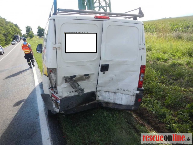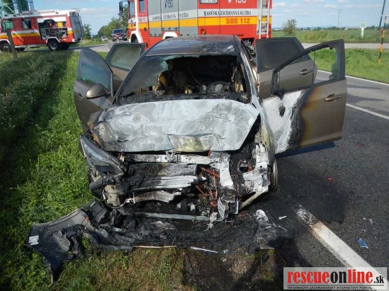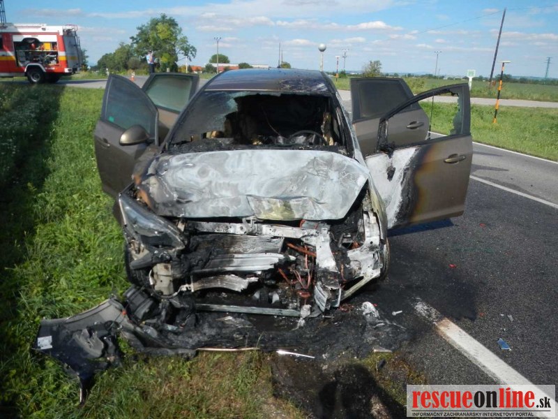 KRPZ Trnava /MM/ Včera (2. augusta 2016) v poobedňajších hodinách bola ohlásená dopravná nehoda osobného motorového vozidla a dodávky s následným požiarom na štátnej ceste č. II/504 v katastri obce Malženice. Na mieste udalosti zasahovali hasiči z Trnavy. V čase príchodu hasičov na miesto udalosti bolo osobné motorové vozidlo z polovice zasiahnuté požiarom v smere od motora. Na lokalizáciu a likvidáciu požiaru vozidla hasiči použili jeden C prúd a jeden vysokotlaký prúd. V dôsledku dopravnej nehody došlo k zraneniu troch osôb. Zraneným osobám poskytli hasiči predlekársku prvú pomoc. Havarované automobily zabezpečili vozidlá proti vzniku požiaru a úniku prevádzkových kvapalín. Príčina vzniku požiaru je pravdepodobne dopravná nehoda.