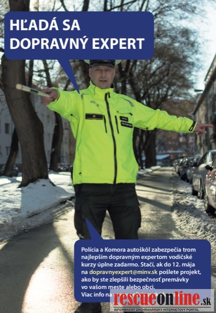 Druhý preventívny projekt HĽADÁ SA DOPRAVNÝ EXPERT je určený pre stredné školy. Policajný zbor v spolupráci so Slovenskou komorou výcvikových zariadení autoškôl zabezpečí pre troch výhercov vodičský kurz úplne zadarmo. Hlavnou podmienkou preventívnej súťaže je poslať projekt na tému „Ako by som zlepšil bezpečnosť cestnej premávky v mojom meste (obci)“. Policajti vyhodnotia tri najlepšie projekty. Svoje nápady môžete posielať do 12. mája na e-mailovú adresudopravnyexpert@minv.sk. Odmenou pre stredoškolákov nebude iba vodičský kurz zadarmo, ale aj skutočné zapracovanie ich pripomienok do činnosti Policajného zboru priamo v ich meste alebo obci.