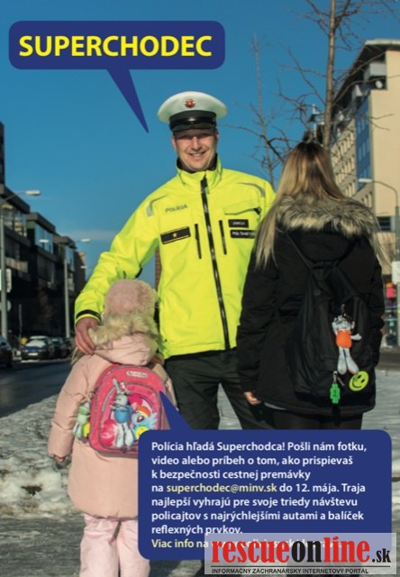 Prvý preventívny projekt SUPERCHODEC je určený pre základné školy. Zapojiť sa doň môžu jednotlivci, ale aj kolektívy. Ich jedinou úlohou je poslať do 12. mája na e-mailovú adresu superchodec@minv.sk fotografie, videá alebo skutočné príbehy o tom, ako zo svojho pohľadu chodcov prispievajú k bezpečnosti premávky. Je len na žiakoch, či pošlú napríklad svoje fotografie s reflexnými prvkami, videá správneho prechádzania cez cestu, alebo svoj deň ako chodca opíšu vo forme príbehu. Po uzávierke súťaže polícia vyberie troch výhercov, ktorí pre svoju triedu vyhrajú návštevu policajtov s najrýchlejšími autami a balíčky reflexných prvkov. Trieda SUPERCHODCA alebo SUPERCHODCOV bude aj prezentovaná na oficiálnom policajnom Facebooku.