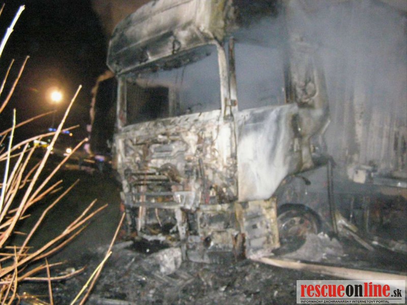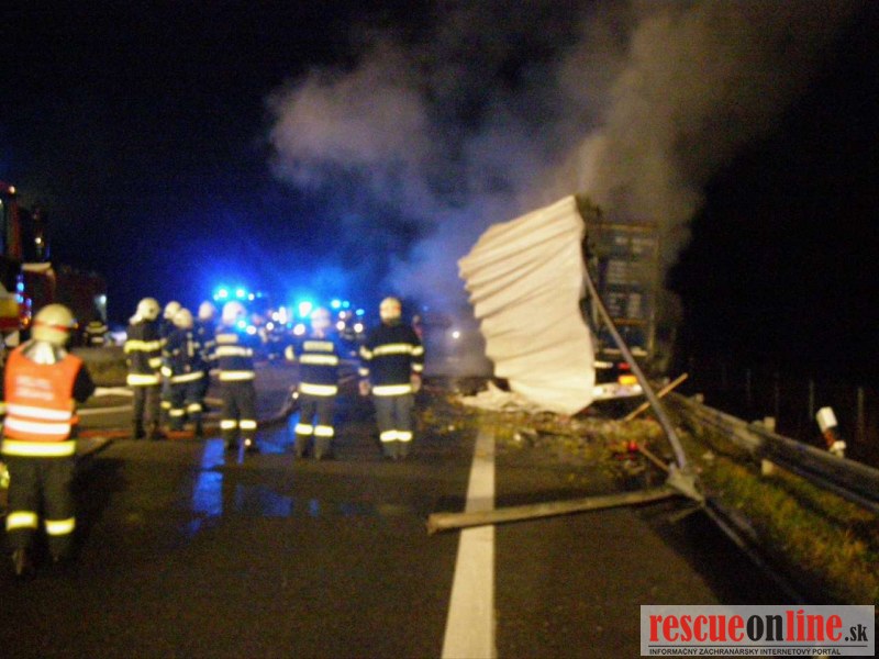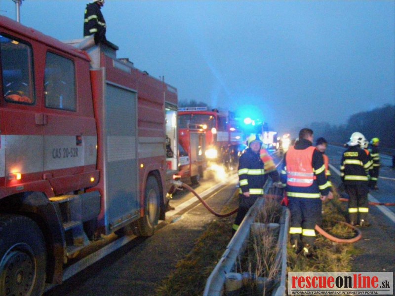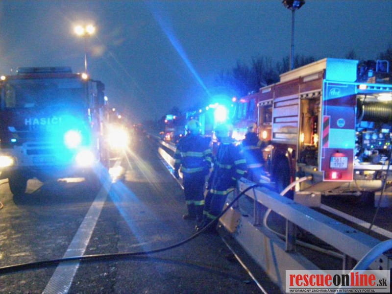 KR HaZZ Trnava |MM| Dnes (15. decembra 2014) krátko po 06.00 hod. ráno bol ohlásený požiar dvoch kamiónov na diaľnici D2 (na území Českej republiky). Ako prví na miesto udalosti dorazili hasiči z Kútov. Ihneď po príchode začali s likvidáciou požiaru nákladných automobilov. Vodič jedného z havarovaných vozidiel bol mimo vozidla a hasiči mu poskytli predlekársku zdravotnú starostlivosť a následne ho odovzdali do starostlivosti zdravotníkom záchrannej zdravotnej služby. Počas likvidačných prác dorazili na miesto udalosti jednotky Hasičského a záchranného zboru Českej republiky, ktoré sa zapojili do likvidácie požiaru a vykonávali vyhľadávanie nezvestného vodiča druhého vozidla. Jeho telo hasiči našli pod ťahačom a vodič nejavil známky života. Príčina vzniku požiaru je v štádiu zisťovania.