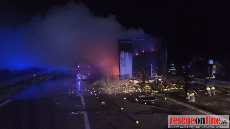 KR HaZZ Trnava |MM| Dňa 9. septembra 2015 v noci krátko po 01.30 hod. bol ohlásený požiar kamióna, ktorý prevážal paradajky uložené v prepravkách. Požiar návesu kamiónu vznikol na D1 v smere na Bratislavu pri obci Horná Streda. Na mieste udalosti zasahovali hasiči z Nového Mesta nad Váhom a hasiči z Piešťan. Likvidácia požiaru si vyžiadala nasadenie 9 hasičov a 5 ks hasičskej techniky. Požiar sa podarilo uhasiť krátko po 04.00 hodine.