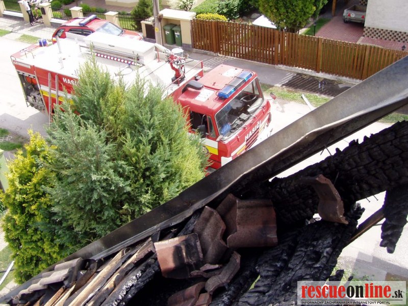 KR HaZZ Trnava |MM| Na ohlasovňu požiarov OR HaZZ v Galante bol dňa 21. mája 2012 o 13:28 hod. prostredníctvom Koordinačného strediska IZS v Trnave nahlásený požiar rodinného domu v obci Pusté Úľany (okres Galanta). Na miesto udalosti boli povolaní štyria príslušníci HaZZ z hasičskej stanice v Galante s technikou Mercedes Benz Atego a CAS 30 Iveco Trakker, následne ešte jeden príslušník s výškovou technikou PP-27 T-815. Po príchode na miesto udalosti bolo prieskumom zistené, že sa jedná o požiar strechy dvojpodlažného rodinného domu. Požiar sa ešte pred príchodom hasičskej jednotky snažili hasiť prítomné osoby - susedia, neskôr aj majiteľ domu záhradnými hadicami. Na vylúčenie prítomnosti osôb vo vnútri a na zistenie skrytých ohnísk bol prostredníctvom termovíznej kamery vykonaný prieskum interiéru domu, na základe ktorého mohol veliteľ zásahu konštatovať, že v dome sa nikto nenachádzal a požiar sa našťastie nepreniesol zo strechy do vnútorných priestorov domu. Veliteľ zásahu nariadil nasadiť na lokalizáciu a likvidáciu jeden vysokotlakový prúd a jeden „C“ prúd, zároveň boli použité rebríky z prítomných hasičských vozidiel. Príslušníci HaZZ za súčasného hasenia a ochladzovania horiacich trámov a dreveného podbitia stropu v povalovom priestore domu vykonávali rozoberanie strešnej konštrukcie. Na povalu domu na hasenie požiaru z vnútornej strany bola vyslaná dvojčlenná skupina v autonómnych dýchacích prístrojoch. Po príchode na miesto udalosti prevzal velenie riaditeľ OR HaZZ v Galante, následne povolal na miesto udalosti ďalších dvoch príslušníkov s technikou CAS 32 T-815, ktorí boli nasadení na likvidačné práce z vonkajšej strany strechy. Na miesto udalosti sa dostavil aj zistovateľ príčin požiarov z OR HaZZ v Galante. Po lokalizácii a čiastočnej likvidácii požiaru bola na základňu odoslaná technika PP-27 T-815 s dvomi príslušníkmi. Po úplnej likvidácii požiaru o 14:54 hod. bol vykonaný prostredníctvom termovíznej kamery záverečný prieskum a miesto udalosti bolo odovzdané majiteľovi, ktorý bol náležite poučený o potrebných opatreniach. Po zdokumentovaní udalosti a zbalení vecných prostriedkov sa hasičská jednotka vrátila o 15:34 hod. na základňu. Následkom požiaru vznikla majiteľovi rodinného domu priama materiálna škoda, predbežne vyčíslená na 5.000,- €. Príčina vzniku požiaru je v štádiu vyšetrovania.