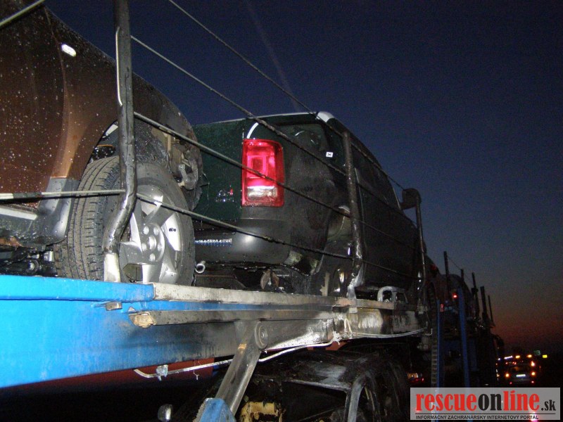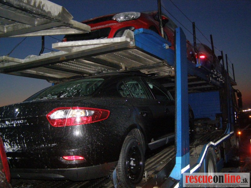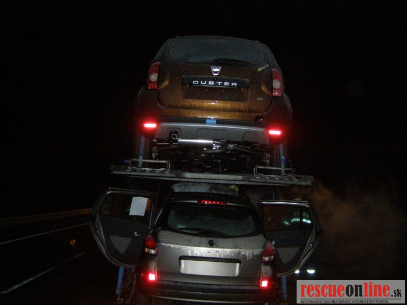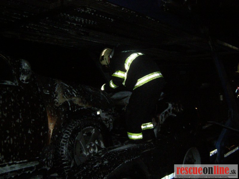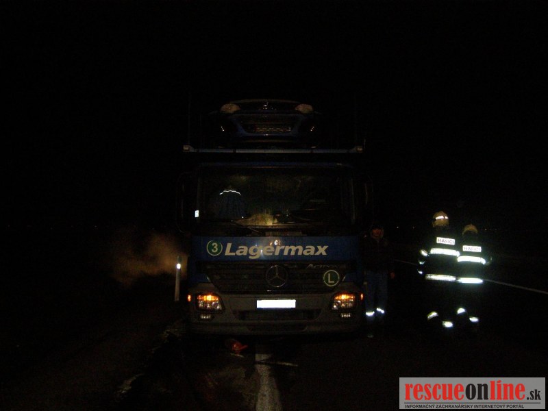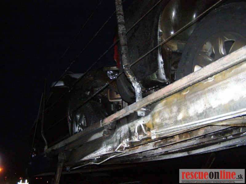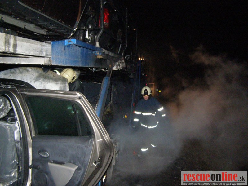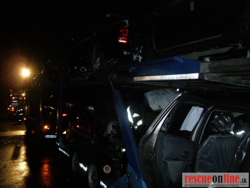 KR HaZZ Trnava |MM| V pondelok 30. januára 2012 o 05:06 hod. bol ohlásený požiar nákladného motorového vozidla na cestnej komunikácii R1 v smere Trnava - Nitra. Na zásah bolo vyslaných šesť príslušníkov Hasičského a záchranného zboru z hasičskej stanice v Trnave. Po príjazde na miesto udalosti bolo zistené, že požiarom bol zasiahnutý ťahač MB Actros s prívesom. Na prívese bolo prepravovaných sedem osobných automobilov, z ktorých štyri boli zasiahnuté požiarom. Príslušníci HaZZ zasahovali jedným „C“ prúdom, jedným vysokotlakovým prúdom a jedným vysokotlakovým prúdom s ťažkou penou. Počas zásahu bolo miesto udalosti osvetľované agregátom z MB Atego. Po likvidácii požiaru boli všetky vozidlá skontrolovane termokamerou. Na dvoch vozidlách bola odpojená autobatéria. Pri požiari boli použité dýchacie prístroje. Následkom požiaru vznikla majiteľovi nákladného motorového vozidla priama materiálna škoda predbežne vyčíslená na 70 000,- €. Príčinou vzniku požiaru bola technická porucha kolesa na prívese ťahača. po ukončení zásahu sa jednotka HaZZ o 06:59 hod. vrátila na základňu.