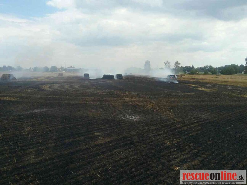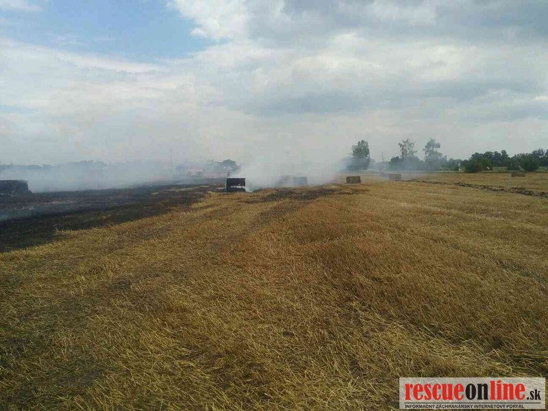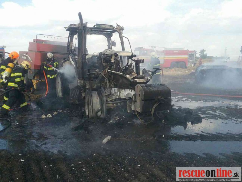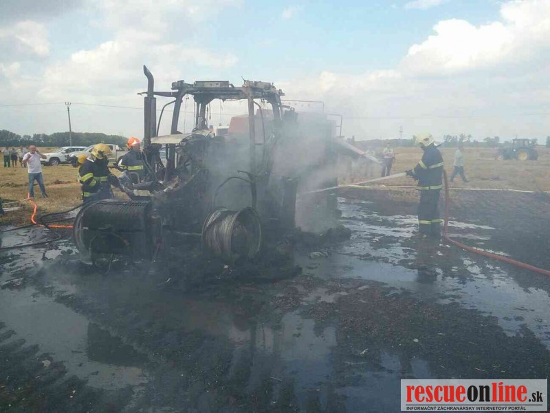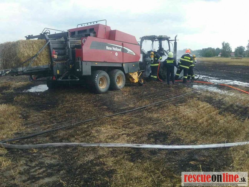 Požiar traktora, balíkovača a balíkov slamy na poli pri obci Baka