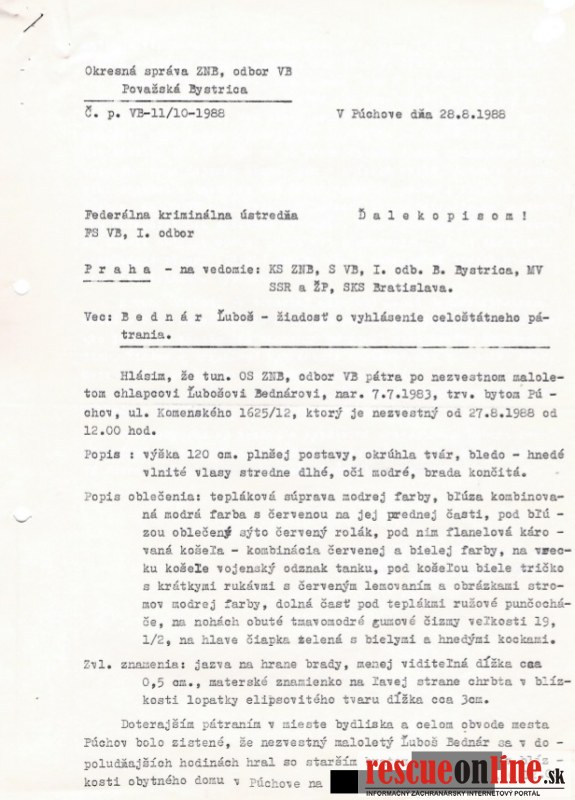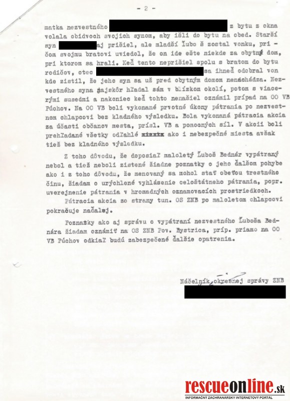 „Doterajším pátraním v mieste bydliska a celom obvode mesta Púchov bolo zistené, že nezvestný maloletý Ľuboš Bednár sa v dopoludňajších hodinách hral so starším bratom v blízkosti obytného domu v Púchove. O 12:00 matka nezvestného z bytu z okna volala obidvoch svojich synov, aby išli do bytu na obed. Starší syn aj prišiel, ale mladší Ľuboš zostal vonku, pričom svojmu bratovi uviedol, že on ide ešte niekde za obytný dom, pri ktorom sa hrali. Keď tento neprišiel spolu s bratom do bytu rodičov, otec sa ihneď odobral von, kde zistil, že jeho syn sa už pred obytným domom nenachádza. Nezvestného syna najskôr hľadal sám v blízkom okolí, potom s viacerými susedmi a nakoniec keď ho nenašiel, oznámil prípad na OO VB Púchov. Na OO VB boli vykonané prvotné úkony pátrania po nezvestnom chlapcovi bez kladného výsledku. Bola vykonaná pátracia akcia za účasti občanov mesta, príslušníkov VB a pomocných síl,“píše sa v prvom zázname prijatom v súvislosti s nezvestným Ľubošom Bednárom.
