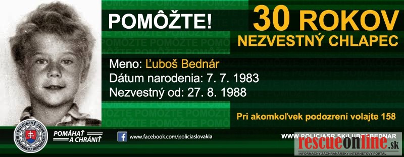 Prezídium PZ SR |MM| Presne pred 30 rokmi, dňa 27. augusta 1988, sa pred domom v Púchove hral vtedy päťročný Ľuboš Bednár. Za doposiaľ nezistených okolností sa stratil. Napriek snahe vtedajších príslušníkov Verejnej bezpečnosti a neskôr Policajného zboru, neboli dodnes získané informácie, ktoré by viedli k jeho vypátraniu. V histórii československej kriminalistiky ide o jeden z najstarších a ojedinelých prípadov, keď nebola objasnená nezvestnosť maloletej osoby. V súlade so stanovenými predpismi bolo pátranie po nezvestnom zastavené po uplynutí 20-ročnej lehoty, v roku 2008.