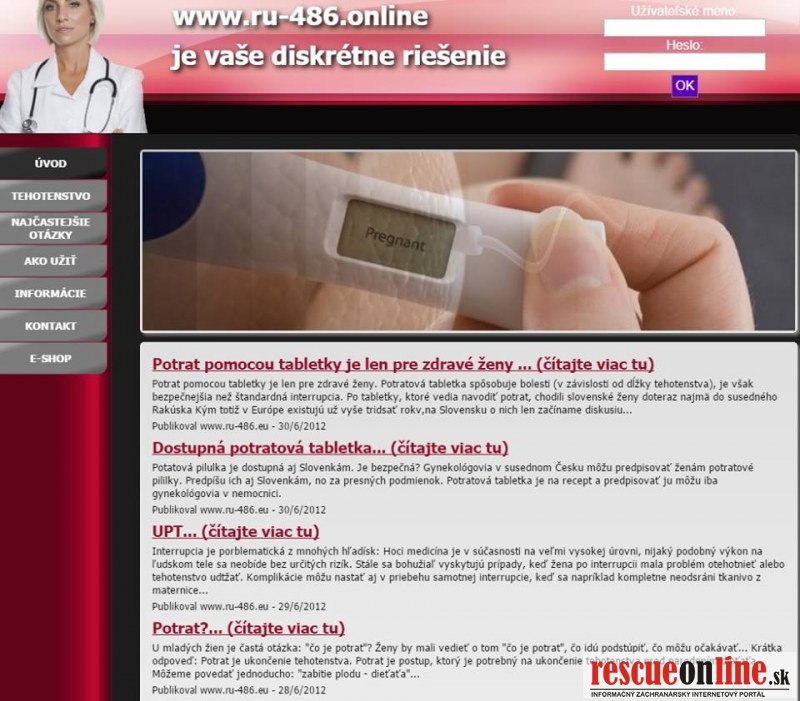 Dňa 1.2.2018 vo večerných hodinách príslušníci Národnej kriminálnej agentúry Prezídia Policajného zboru zadržali na pošte v Trenčíne podozrivú osobu, ktorá prostredníctvom internetu predávala lieky neznámeho pôvodu slovenským zákazníkom. Využívala na to stránku www.ru-486.eu.