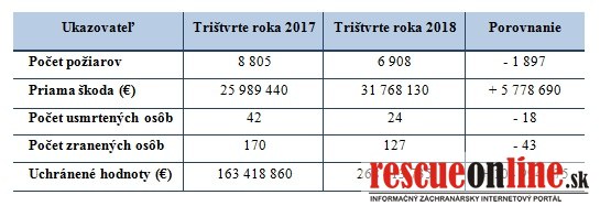 Prezídium HaZZ |MM| Za trištvrte roka 2018 vzniklo na území Slovenskej republiky 6 908 požiarov a škody nimi spôsobené sú vo výške 31 768 130 €. V porovnaní s rovnakým obdobím predchádzajúceho roka došlo k poklesu počtu požiarov o 1 897 prípadov (pokles o 21,5 %), naopak škody boli vyššie o 5 778 690 € (nárast o 22 %). Pri týchto požiaroch bolo usmrtených 24 osôb a zranených 127 osôb, pričom tieto hodnoty predstavujú oproti rovnakému obdobiu minulého roka pokles, a to v počte usmrtených o 43 % a v počte zranených o 25 %. Z celkového počtu usmrtených osôb bolo 11 vo vekovej kategórii od 15 do 60 rokov a 13 prekročilo vekovú hranicu 60 rokov. Najviac zranených (68 %) bolo vo veku od 15 do 60 rokov, takmer štvrtina z celkového počtu zranených boli osoby staršie ako 60 rokov, zranených bolo tiež 7 detí.