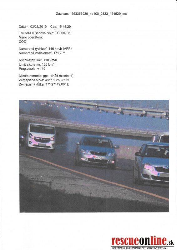 KRPZ Trnava |MM| Príslušníci trnavskej diaľničnej polície namerali v sobotu (23.3.) na diaľnici D1 v katastri obce Cífer, v smere na Bratislavu, vodiča, ktorý prekročil rýchlosť o 36 km/h. Na úseku, v ktorom je povolená maximálna rýchlosť 110 km/h, išiel 146 km rýchlosťou. Počas kontroly vodiča vykonali u neho policajti aj dychovú skúšku na alkohol, ktorá vyšla pozitívne. V čase okolo 16. h vodič „nafúkal“ 0,55 mg, čo je v prepočte 1,15 promile alkoholu. Polícia v tejto súvislosti vedie trestné stíhanie pre ohrozenie pod vplyvom návykovej látky. Vodičovi bola na jeho požiadanie odobratá krv, bol mu zadržaný vodičský preukaz.