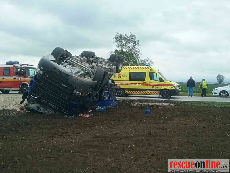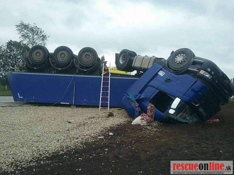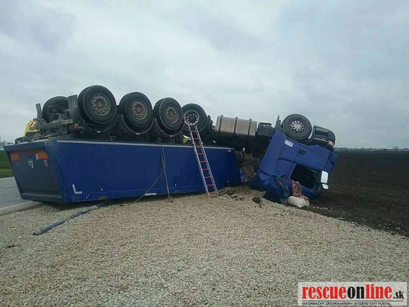 Prevrátený kamión prevážajúci štrk pri Trnave