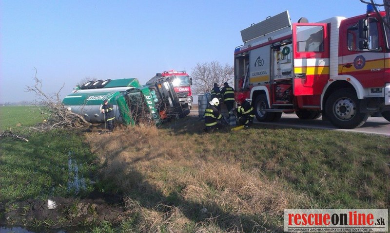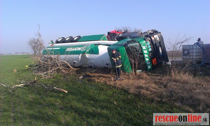 Polícia zasahovala dnes ráno pri havárii cisterny na ceste medzi obcami Dolné Saliby a Kráľov Brod. 61 ročný vodič z Komárna išiel prirýchlo, nezvládol riadenie a s návesom sa prevrátil mimo cestu. V cisterne prevážal 40000 litrov nafty. Pri náraze došlo k úniku asi 8000 litrov nafty, ktoré hasiči prečerpali. Policajti podrobili vodiča dychovej, ktorá bola negatívna. Pri nehode sa vodič ľahko zranil, na mieste havárie bol jednorazovo ošetrený. Polícia uložila vodičovi na mieste blokovú pokutu v zmysle zákona.