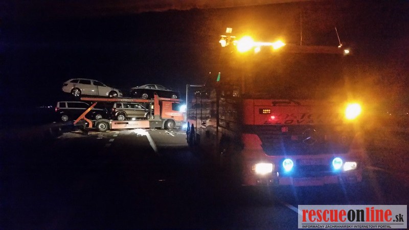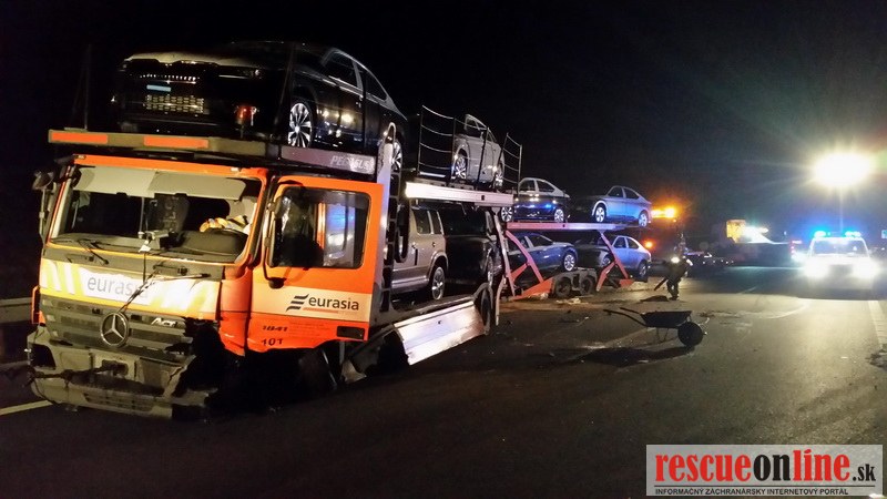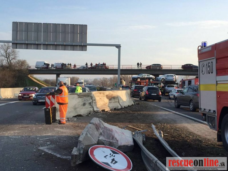 Odťahovka Jaslovský |MM| Dnes v poobedných hodinách došlo na diaľnici D2 k dopravnej nehode. Autoprepravník jazdiaci v smere od Malaciek na BA prešiel do rýchleho pruhu, narazil do betónových deliacich zábran, posunul ich do protismeru, následne do nich vrazilo osobné vozidlo idúce z Bratislavy. To skončilo úplne zničené v priekope. Jednu ženu odviezol z miesta nehody vrtuľník s ťažkými zraneniami do nemocnice.