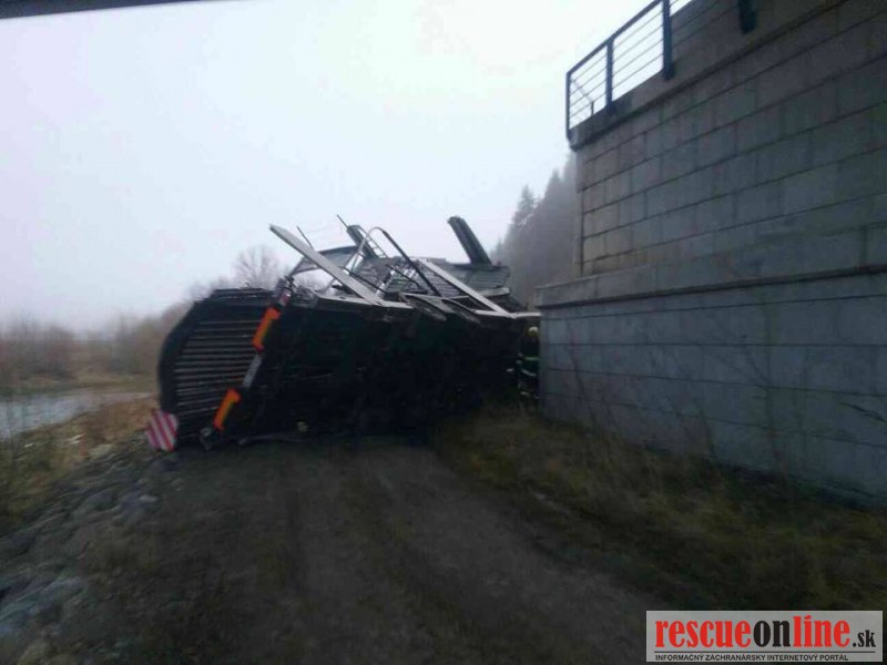 Hasiči momentálne zasahujú pri dopravnej nehode na obchvate Tvrdošína, odkiaľ pod most spadol kamión. Po príchode na miesto udalosti sa už mimo vozidla nachádzala jedna zranená osoba, ktorá sa vyslobodila z havarovaného vozidla ešte pred príchodom hasičov. Osoba bola záchrannou zdravotnou službou odvezená do nemocnice. Hasiči momentálne vykonávajú na havarovanom kamióne protipožiarne opatrenia a zachytávajú unikajúce prevádzkové kvapaliny. Pri udalosti zasahujú príslušníci z Tvrdošína.