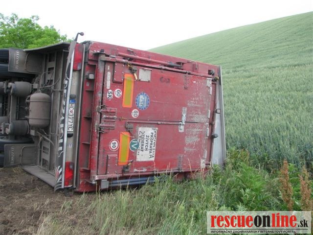 KRPZ Nitra |MM| Včera 12.6. asi o 14,45 došlo v levickom okrese medzi obcami Demandice a Šahy, v katastri obce Dolné Semerovce, ku dopravnej nehode nákladného vozidla Renault Premium naloženého živými prascami. 53 ročný vodič pravdepodobne v dôsledku neprispôsobenia rýchlosti jazdy svojím schopnostiam nezvládol riadenie v ostrej ľavotočivej zákrute a zišiel z cesty na pravú krajnicu, kde sa s vozidlom prevrátil. Pri nehode uhynulo stodva z dvesto prevážaných zvierat.