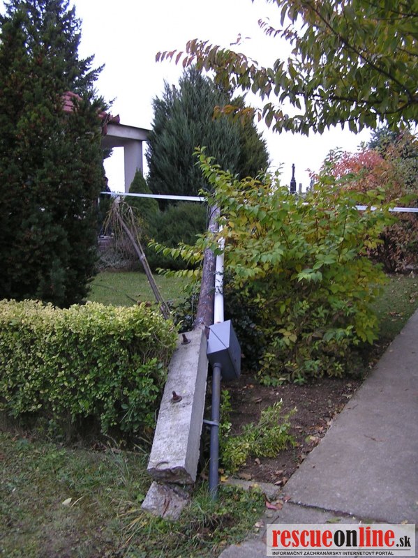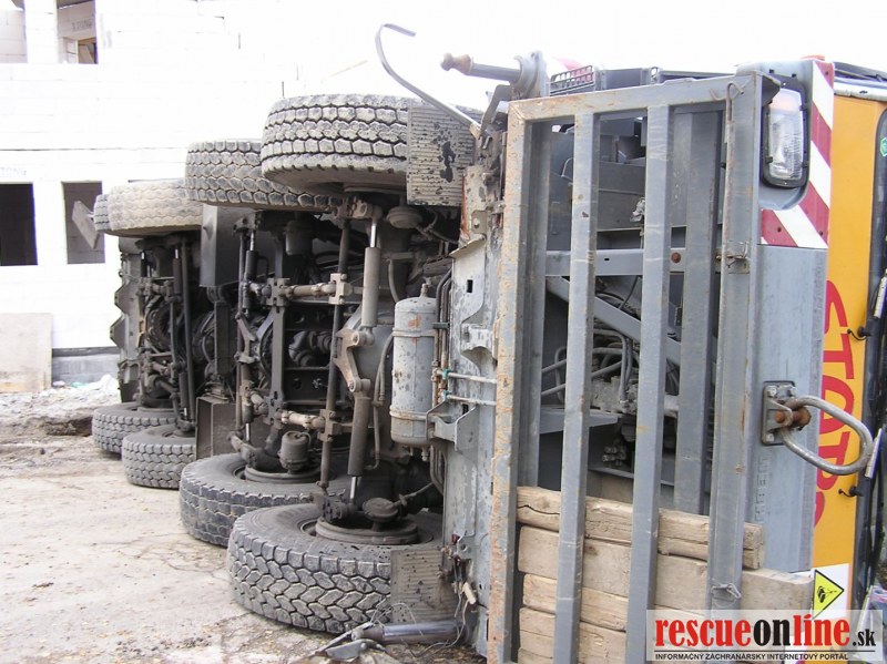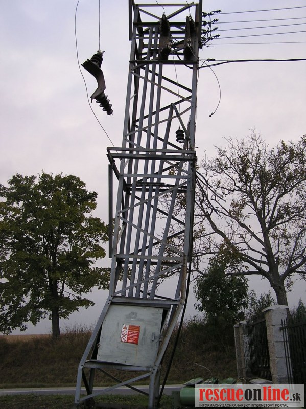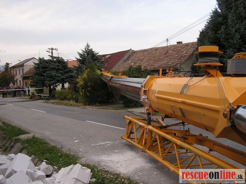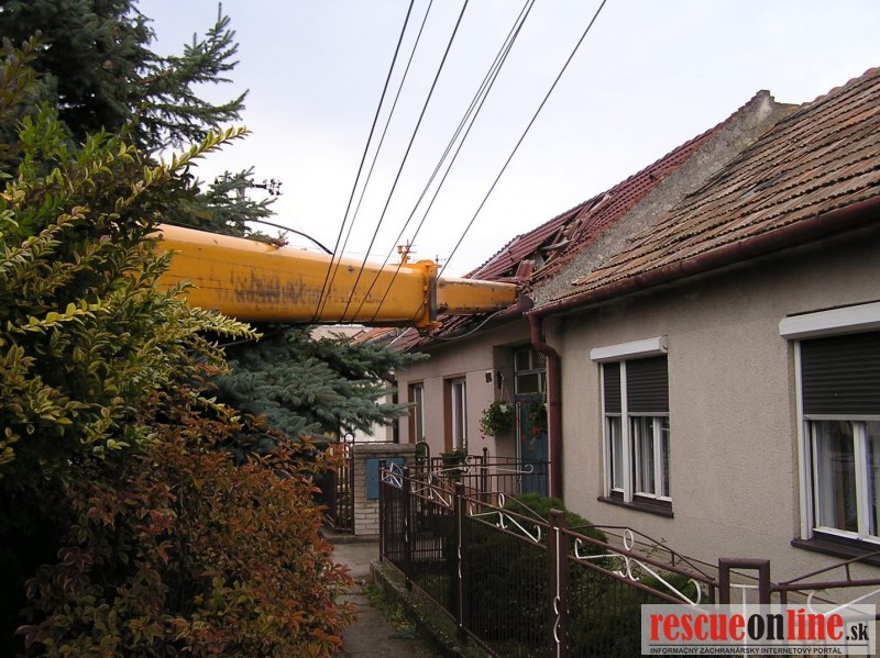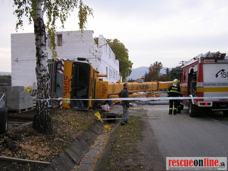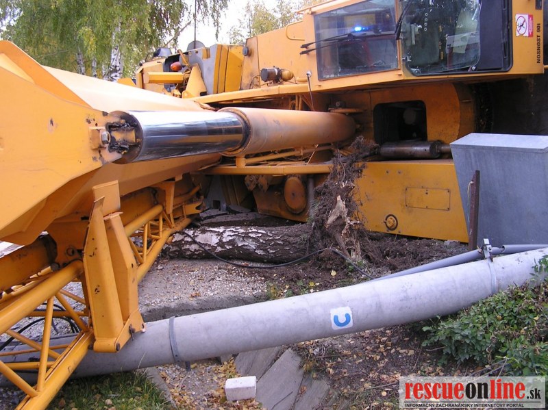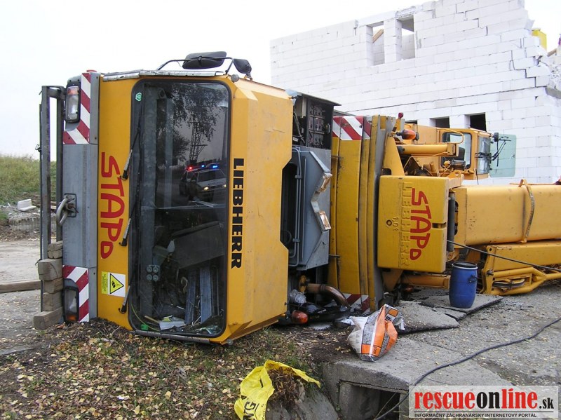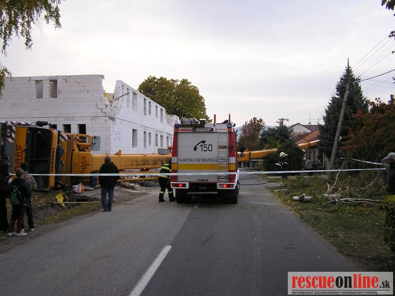KR HaZZ Trnava |MM| Vo štvrtok 27. októbra 2011 o 15,46 hod bol políciou na operačné stredisko OR HaZZ v Trnave ohlásený prevrátený žeriav /žeriav Liebher 90t/ cez cestu, s ramenom padnutým na strechu rodinného domu a pretrhnuté elektrické vedenie v obci Košolná pri poškodenom rodinnom dome v okrese Trnava. Zasahovali štyria príslušníci HaZZ z hasičskej stanice v Trnave s technikou MB Vario. Po príjazde na miesto udalosti a vykonanom prieskume zistili, že po páde ramena žeriavu boli poškodené tri betónové stĺpy, jeden drevený a jeden železný stožiar bol ohnutý. Na železnom stožiari bol odtrhnutý transformátor, ktorý sa pri páde na zem rozbil a vytiekol z neho olej. Na mieste sa nachádzali elektrikári ZSE a Enermontu, ktorí sa postarali o vybagrovanie odvezenie nasiaknutej zeminy. Príslušníci HaZZ zastavili únik hydraulického oleja zo žeriavu, vykonali protipožiarne zabezpečenie žeriavu odpojením akumulátorovej batérie a na žiadosť polície osvetľovali miesto udalosti z dôvodu pretrhnutého elektrického vedenia. S príslušníkmi polície zabezpečili evakuáciu obyvateľov piatich rodinných domov na voľné priestranstvo. V dôsledku udalosti nedošlo k usmrteniu alebo zraneniu osôb. Miesto udalosti bolo vymedzené páskou, cesta bola neprejazdná a doprava bola riadená políciou. Konateľ firmy, ktorej žeriav patril, zabezpečil ďalšie dva žeriavy na zdvihnutie prevráteného žeriavu, zabezpečil osvetlenie miesta vlastnými prostriedkami, Vapex a nádoby na prípadný únik oleja zo žeriavu. Po dohode so zástupcami