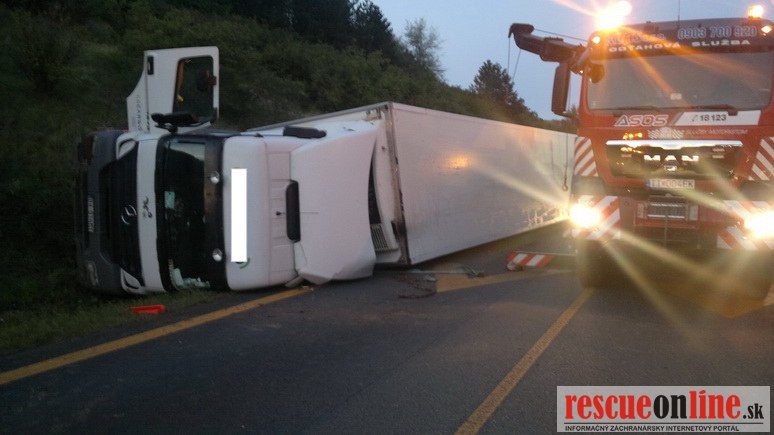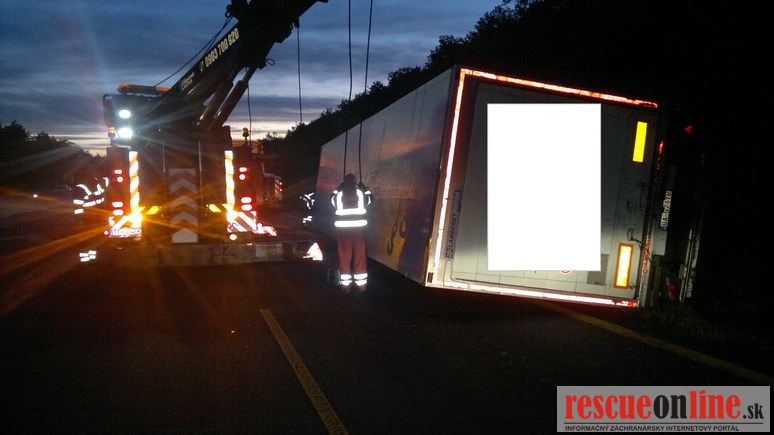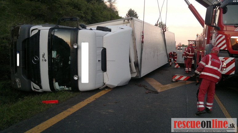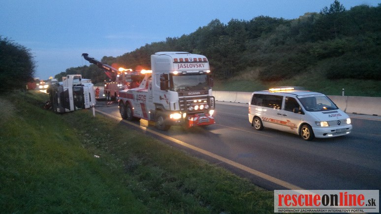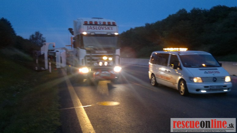 Odťahovacia služba Jaslovský s.r.o. člen ASOS 18 123 |MM| Dnes ráno sa stala dopravná nehoda na diaľnici D1- 27,5 km v smere od Senca na Trnavu v čase 04,00 hod. Kamión s nákladom 12 –tich paliet prázdnych pivových fliaš pri jazde z Bratislavy do Beckova zišiel z vozovky a následne sa prevrátil. V uvedenom mieste boli vyslobodzovacou technikou obsadené dva jazdné pruhy riadne označené so svetelným výstražným zariadením ND spoločnosťou. Premávka bola obmedzená do jedného „rýchleho“ jazdného pruhu. V čase 06,00 hod. v dobe, kedy sa na mieste udalosti zdržovalo celkovo 9 oprávnených osôb. / dvaja pracovníci NDS, piati zamestnanci odťahovacej služby združenia ASOS. Vodič prevráteného kamiónu a vodič náhradného ťahača./