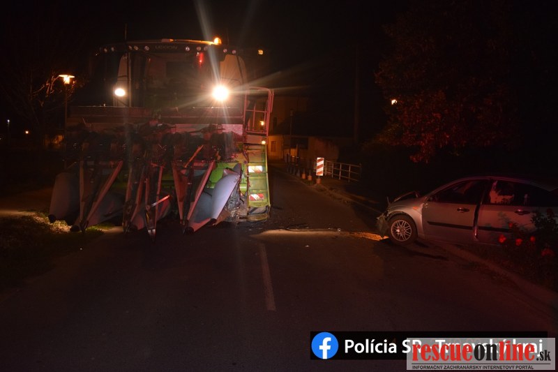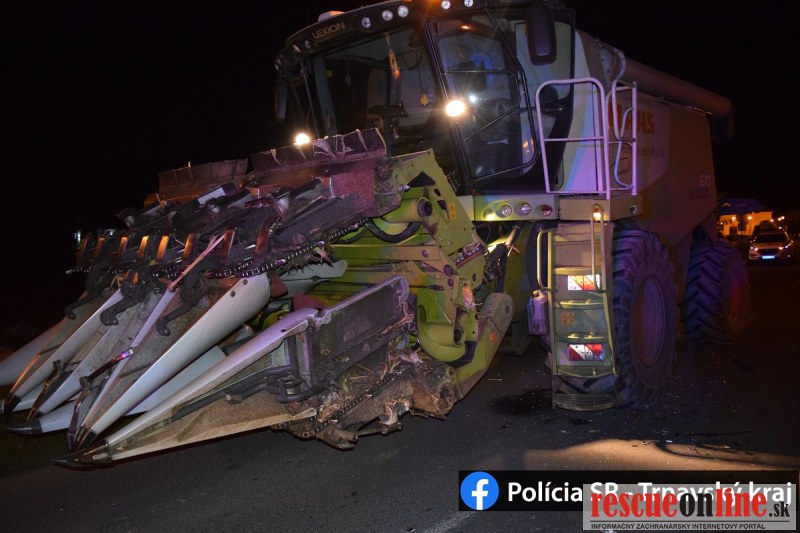 KRPZ Trnava |MM| Polícia bola privolaná k nehode osobného auta a kombajnu. Vo večerných hodinách viedol v obci Horné Saliby (okr. Galanta) 51 ročný muž osobné auto Ford Focus smerom na Tomášikovo. Na hlavnej ceste, v blízkosti cukrárne, prešiel do protismeru a tu sa zrazil s oprotiidúcim kombajnom. Na kombajne bola v dôsledku zrážky predbežne spôsobená škoda 4000 Eur a na dopravnej značke 500 Eur. Polícia podrobila obidvoch vodičov dychovej skúške na alkohol, pričom u vodiča Fordu bola pozitívna. Nameraných mu bolo 1,44 mg, čo sú v prepočte 3 promile.