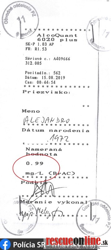 Krátko po polnoci zabránili dvaja mladí muži v jazde opitému 47 ročnému Alejandrovi rovnako zo Španielska. Sadol do toho istého služobného auta a na čerpacej stanici takmer narazil do iného zaparkovaného auta. Následne ho riešila privolaná policajná hliadka. Alejandro pri opakovanej skúške „nafúkal“ 0,99 mg alkoholu, čo je 2,06‰