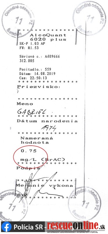 O niekoľko hodín neskôr zavolali znepokojení občania v Šamoríne, časti Mliečno, políciu k popíjajúcemu Španielovi. Toho policajná hliadka zastavila ako jazdil po Starej ceste na Suzuki Vitara. V čase o 22.50 h namerali policajti 44 ročnému Gabrielovi zo Španielska 0,75mg alkoholu, čo je 1,56‰.