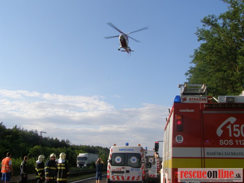 KR HaZZ Trnava |MM| Na operačné stredisko OR HaZZ v Senici bola v stredu 29. júna 2011 o 06:06 hod. nahlásená dopravná nehoda na diaľnici D2 na 27. kilometri so šiestimi zranenými osobami. Na miesto udalosti boli vyslané jednotky z hasičských staníc Senica a Kúty, spolu šesť príslušníkov HaZZ s technikou MB Atego a MB Vario. Po príjazde jednotky na miesto udalosti o 06:27 hod. bolo prieskumom zistené, že na mieste nehody sa už nachádzala sanitka aj so zdravotníkmi, ktorí sa venovali zraneným osobám za asistencie hasičov z Malaciek. Havarované vozidlo Peugeot 807 sa nachádzalo v kríkoch mimo komunikácie. V priebehu pár minút dorazili ďalšie sanitky. Jednotka z HS Senica, vzhľadom na prítomnosť jednotky HaZZ z Malaciek, bola zo zásahu odvolaná. Príslušníci HaZZ z HS Kúty asistovali zdravotníkom pri starostlivosti o zranené osoby a následne aj s nakladaním zranených osôb na nosidlá. Miesto nehody bolo prejazdné len v jednom jazdnom pruhu. Na miesto nehody dorazil aj vrtuľník, ktorý z miesta nehody odvážal jednu zranenú osobu. Počas pristávania vrtuľníka, nakladaní zranenej osoby a jeho odletu bola diaľnica v smere na Malacky uzavretá. Po naložení a odvezení zranených osôb v spolupráci s hasičmi z Malaciek bola vozovka, na ktorej sa nachádzalo rozbité sklo a kusy plastov, pozametaná. Osádku havarovaného vozidla Peugeot 807 tvorili občania z Nórska. Po očistení vozovky sa jednotka HaZZ z HS Kúty o 07:50 hod. vrátila na základňu.