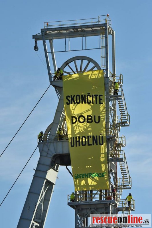 Dnes v ranných hodinách aktivisti Greenpeace vyliezli na ťažobnú vežu v areáli Hornonitrianskych baní v Novákoch. Týmto spôsobom protestestujú proti ťažbe uhlia odkazom na žltom transparente "Skončite dobu uhoľnú !"