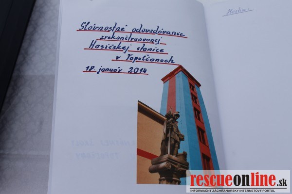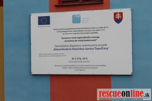 MVSR |MM| V sobotu 18. januára 2014 sa o 15.00 hod. uskutočnilo slávnostné otvorenie zrekonštruovanej hasičskej stanice v Topoľčanoch, na Krušovskej ulici č. 1357. Rekonštrukcia hasičskej stanice v Topoľčanoch sa začala v apríli 2011 a bola ukončená v marci 2013. Projekt bol spolufinancovaný z Európskeho fondu regionálneho rozvoja vo výške 85 % a zo štátneho rozpočtu Slovenskej republiky vo výške 15 %. Výška poskytnutého nenávratného finančného príspevku predstavovala čiastku 812 896,70 EUR. Nenávratný finančný príspevok bol poskytnutý v rámci Regionálneho operačného programu, Opatrenie 4.2. Infraštruktúra nekomerčných záchranných služieb.