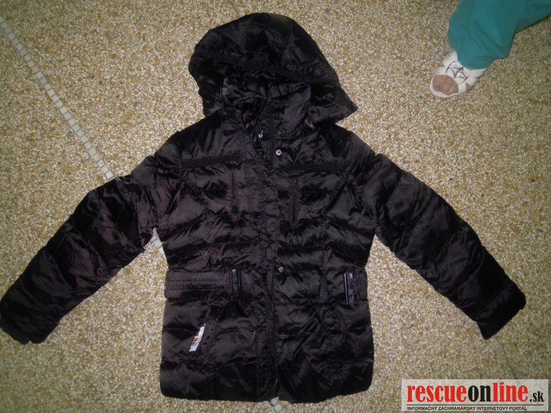 oblečenie: čierne nohavice, šedá mikina s kapucňou, biely sveter na gombíky s kapucňou, čierna bunda s kapucňou, hnedé plátenné topánky č. 40
