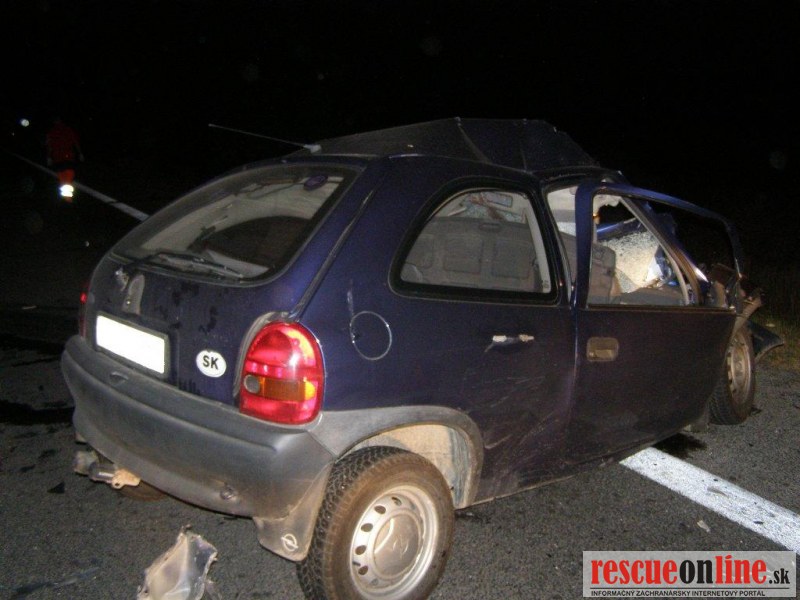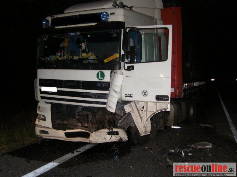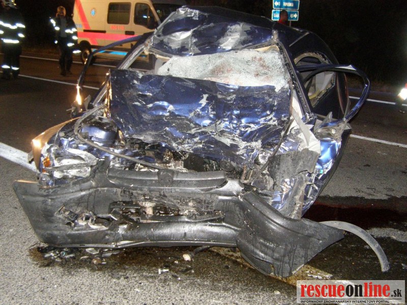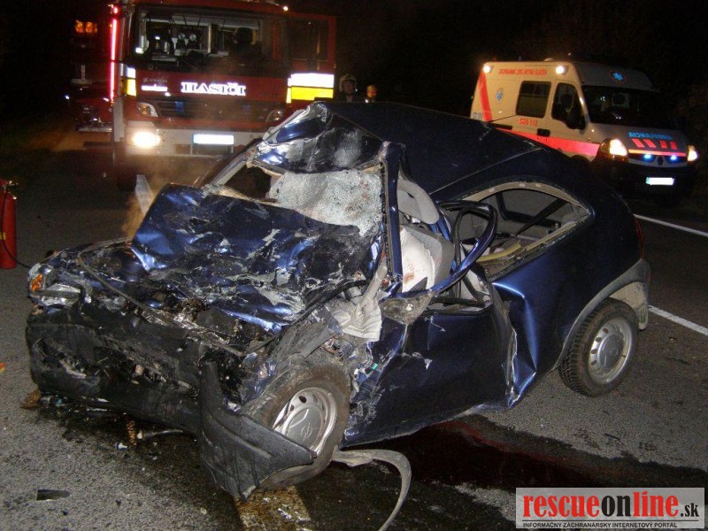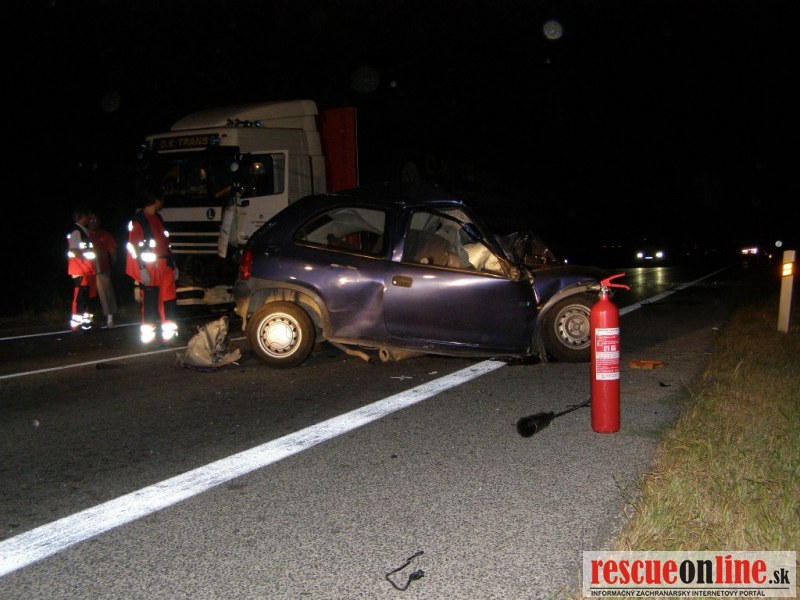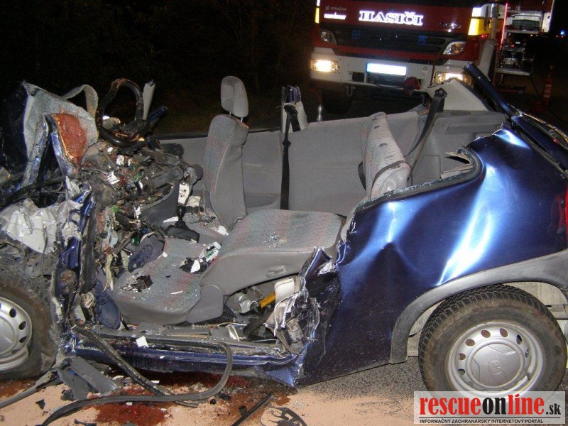 KR HaZZ Trnava |MM| Na operačné stredisko OR HaZZ v Galante bola v pondelok 12. septembra 2011 o 23:25 hod. prostredníctvom Koordinačného strediska IZS v Trnave nahlásená dopravná nehoda osobného motorového vozidla a kamióna na štátnej ceste I. triedy č. 75 v katastri obce Kajal (okres Galanta). Na miesto udalosti boli vyslaní piati príslušníci HaZZ z hasičskej stanice v Galante s technikou MB ATEGO. Po príjazde na miesto udalosti bolo prieskumom zistené, že sa jedná o zrážku osobného motorového vozidla značky OPEL CORSA a kamióna značky DAF s návesom. Na mieste sa nachádzalo vozidlo rýchlej zdravotnej pomoci z Galanty, smerujúce k inej udalosti. Posádka RZP skonštatovala smrť vodiča osobného motorového vozidla. Postihnutá osoba bola zakliesnená vo vozidle, vodič kamiónu vyviazol z nehody bez zranení. Na miesto udalosti sa dostavila policajná hliadka, ktorá odkláňala a riadila dopravu cez obec Kajal. Hasičská jednotka vykonala na vozidlách protipožiarne opatrenia a posypala vytečené prevádzkové kvapaliny sorpčnými látkami. Následne na miesto udalosti dorazila dopravná polícia, ktorá túto nehodu zdokumentovala. Po vykonaní týchto úkonov príslušníci HaZZ za pomoci hydraulického vyslobodzovacieho zariadenia vyslobodili postihnutú osobu z osobného motorového vozidla. Na vozidle bolo potrebné odstrihnúť celú strechu, ľavý bok vozidla a odtiahnuť volantovú tyč pomocou reťazí a rozpínacích klieští a následne odtlačiť palubovku pomocou hydraulického valca. Na miesto udalosti sa dostavil obhliadajúci lekár, ktorý potvrdil smrť vodiča, ako aj odťahová služba na osobné vozidlá, ktorá odviezla osobný automobil na expertízu. Následne hasičská jednotka očistila časť vozovky od úlomkov a prevádzkových kvapalín, ktoré odobrali zamestnanci Správy a údržby ciest. Miesto udalosti osvetľovali príslušníci HaZZ pomocou osvetľovacieho agregátu. Po príchode odťahovej služby na nákladné vozidlá sa kamión s návesom naložil na jej vozidlo, príslušníci HaZZ následne očistili zvyšnú časť vozovky od úlomkov a umyli cestu pomocou vysokotlakového zariadenia. Po ukončení uvedených činností bolo miesto udalosti odovzdané polícii a odťahovej službe a jednotka HaZZ sa o 04:15 hod. vrátila na základňu.