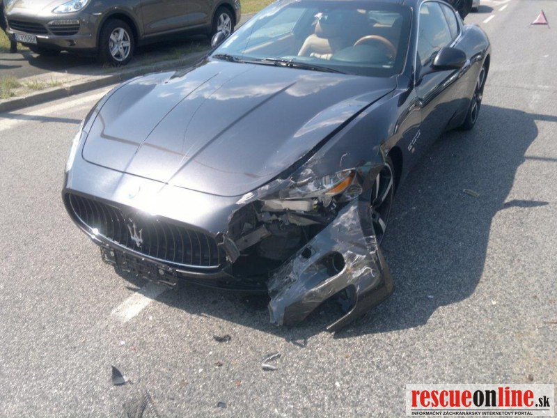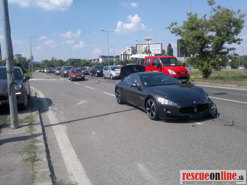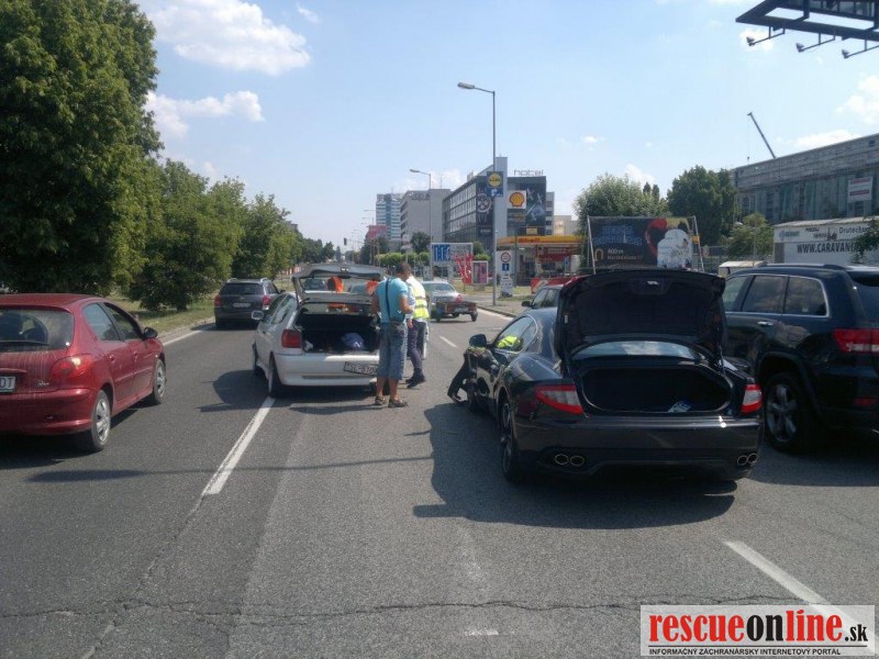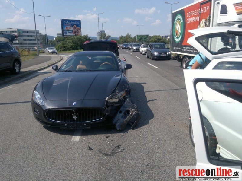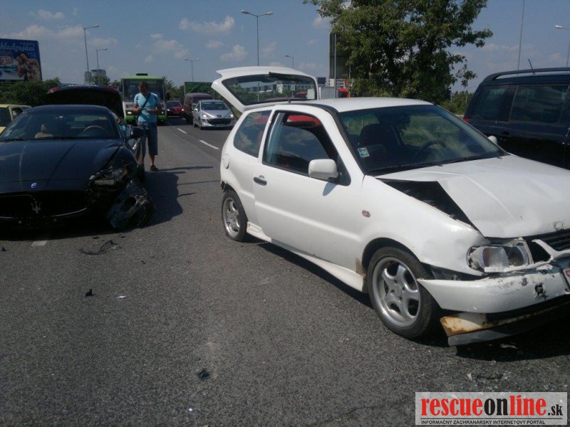 Vodič os.mot. voz. Maserati nedokázal včas zastaviť svoje splašené kone pod kapotou a narazil do VW Pola, ktoré odhodil do pred ním stojaceho Peugeota 407.