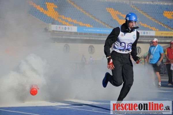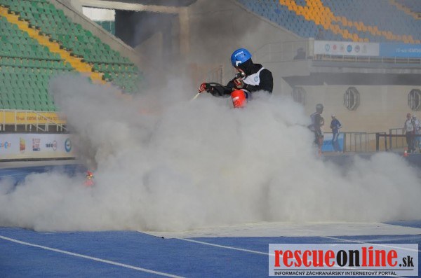 MVSR |MM| Slovenských reprezentantov, ktorí od 4. - 9. septembra 2014 reprezentujú Slovensko na X. ročníku Majstrovstiev sveta v hasičskom športe, dnes čaká posledná disciplína - požiarny útok. V piatok sa uskutočnila disciplína výstup do 4. podlažia cvičnej veže, včera naši reprezentanti súperili s ostatnými družstvami v behu na 100 m cez prekážky a v štafete 4 x 100 m. Slovenská reprezentácia sa po týchto disciplínach nachádza na 8. mieste.