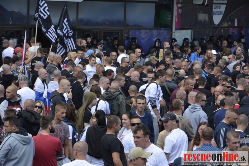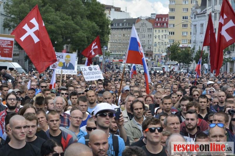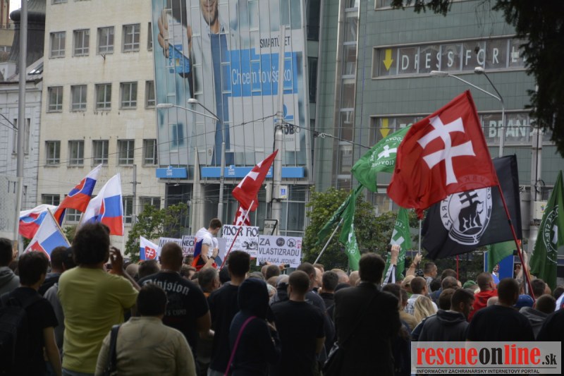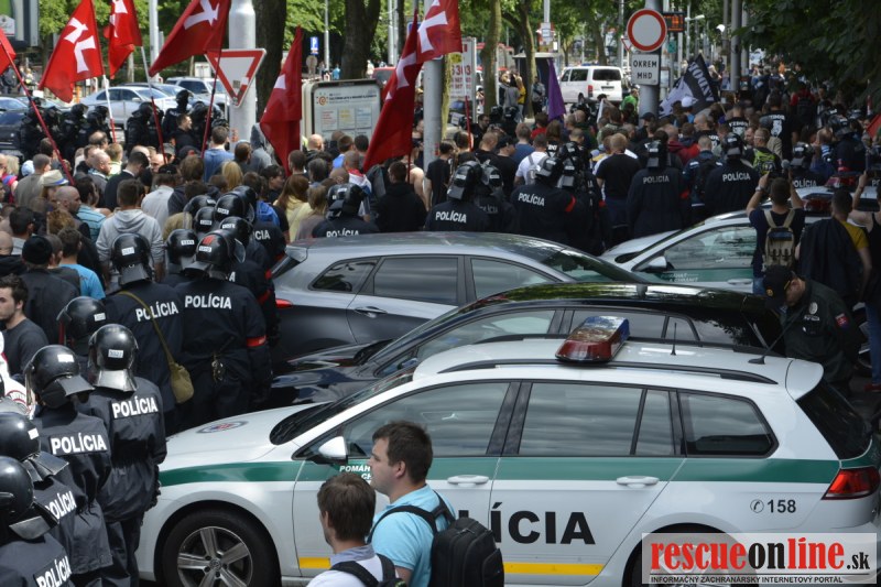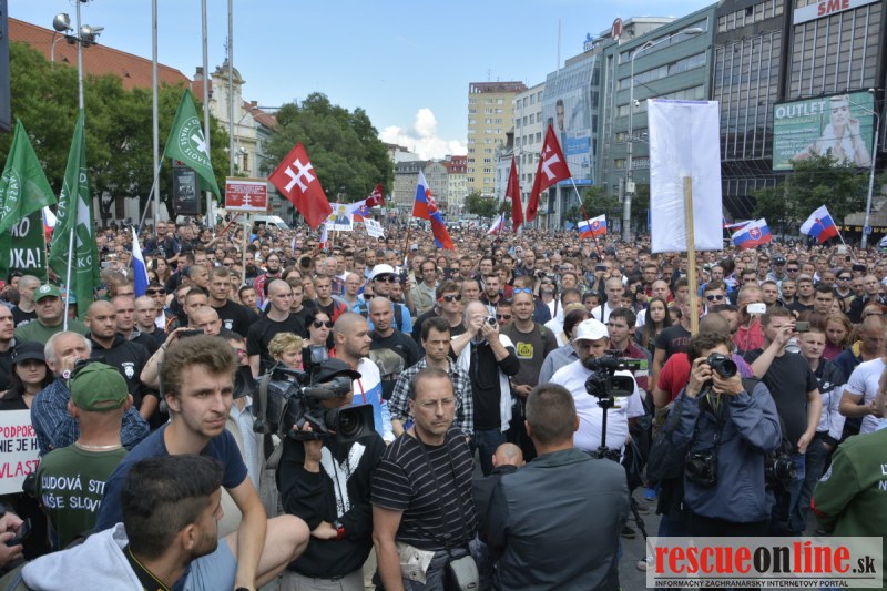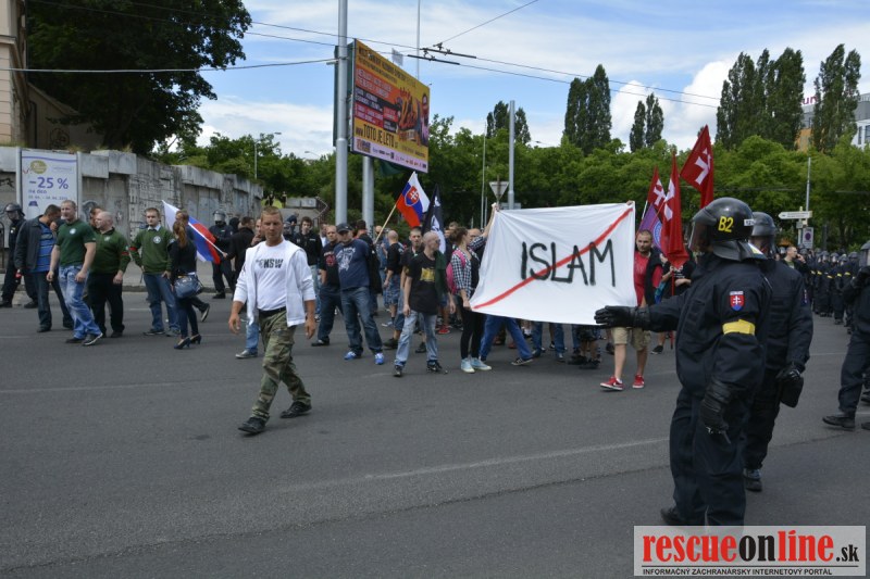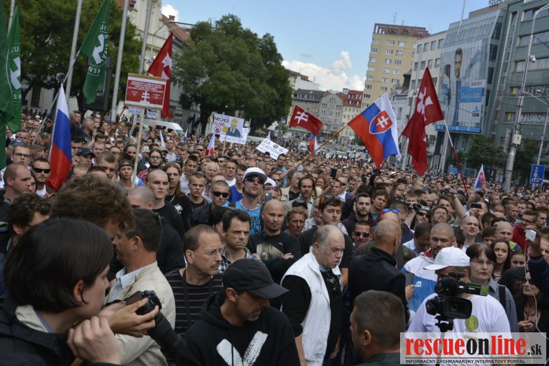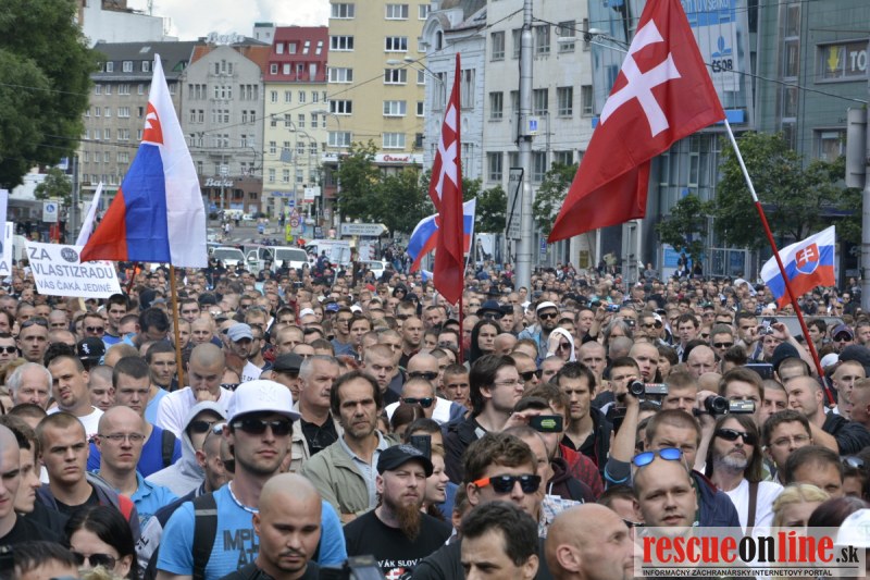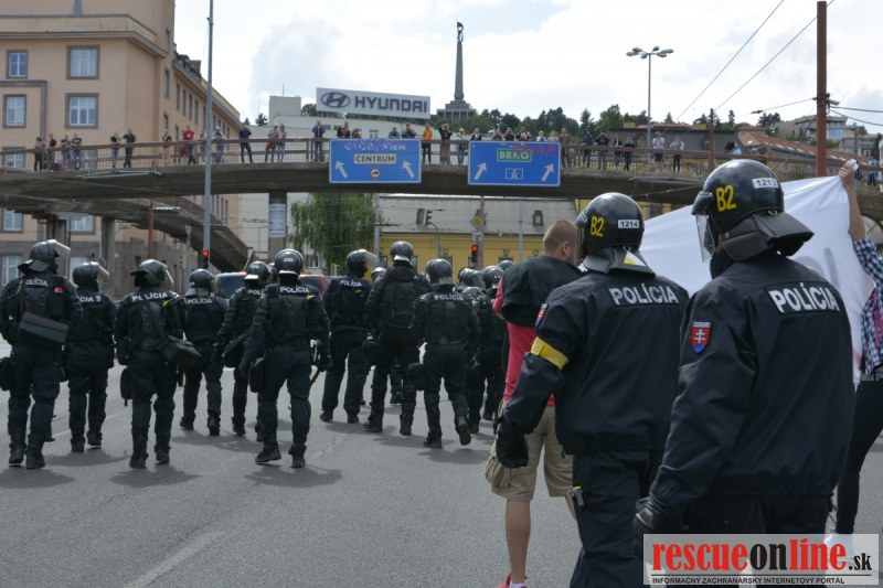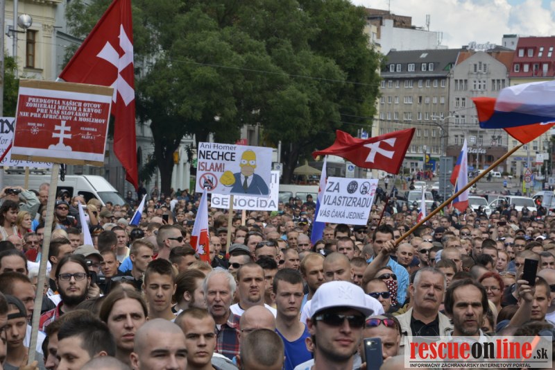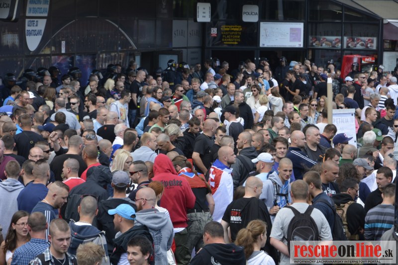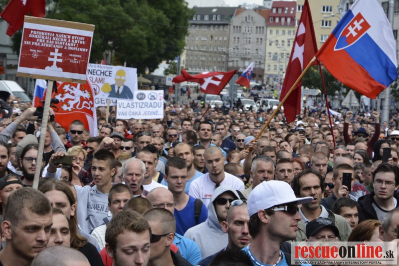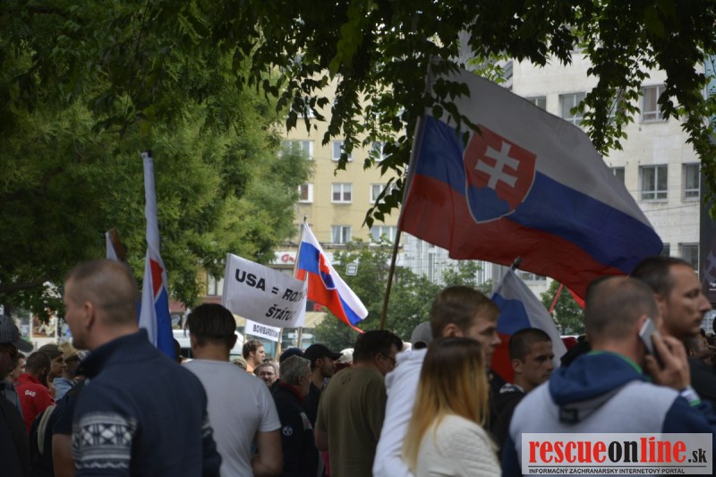 Bratislava | Ešte stále na námestí SNP prebieha občiansky protest izoskupenia Alternatívna cesta pod názvom STOP ISLAMIZÁCII EURÓPY, na ktorý prišli tisíce občanov krajiny. Zraz účastníkov protestu bol o 15.00 hodine na Hlavnej stanici a za doprovodu stoviek policajtov sa protestujúci presunuli na námestei SNP. Prísne bezpečnostné opatrenia sú znateľné v celom centre Bratislavy. Policajné autá so zásahovými jednotkami sa postupne presúvajú tam, kde sú očakávané nepokoje medzi účastníkmi protestu.