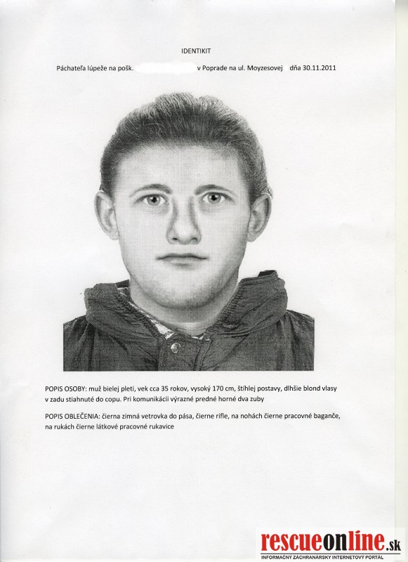 Muž vo veku okolo 35 rokov, cca. 175 cm vysoký, chudej postavy, blond vlasy zopnuté do copa. Oblečené mal čierne rifle, čiernu bundu, robotnícke topánky zv. „baganče“, na rukách platené rukavice čiernej farby, v tvári pribratý, bacuľatý. Hovoril po slovensky. Identikit muža v prílohe.