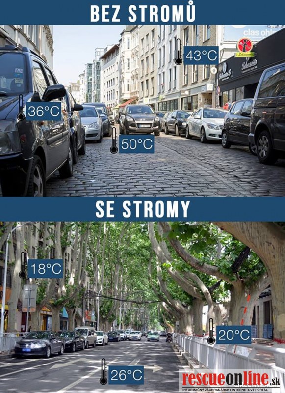 Reálné rozdíly v teplotě nemusí být takto dramatické, obrázek je pouze ilustrační. Slouží ale pro jasnou ilustraci vědecky dokázaného faktu, že stromy dokážou reálně ochlazovat městské mikroklima. ![]()
