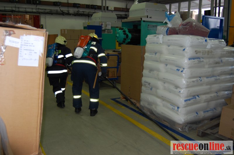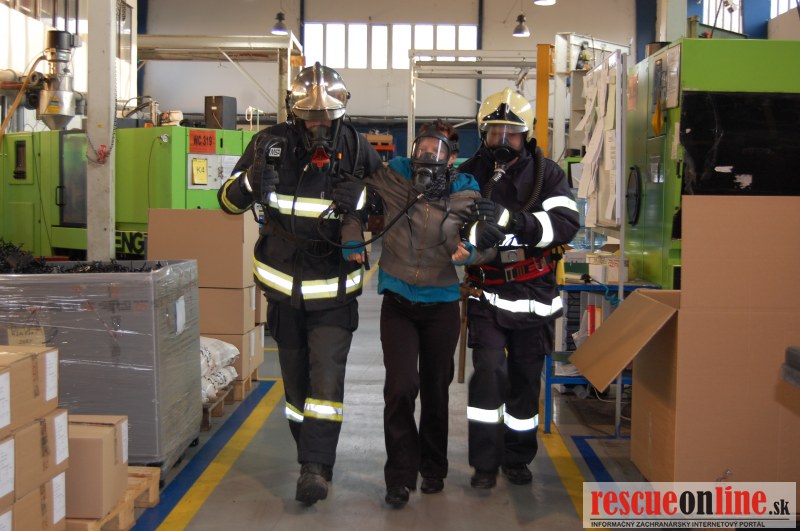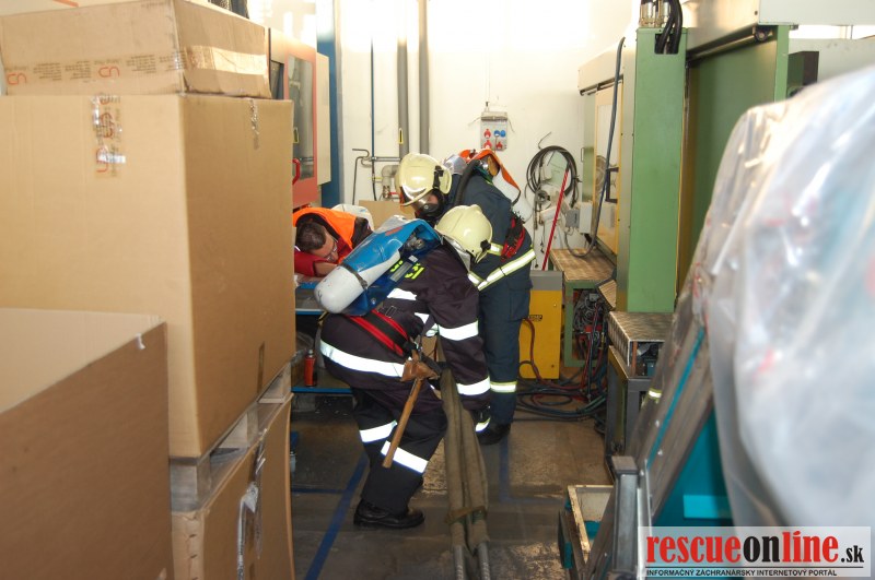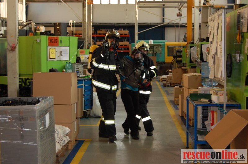 Hasili sme simulovaný požiar výrobnej haly firmy Ulstrup Plast Pobedim v ktorom uviazli 2 zranené osoby, jednu ranenú osobu sme evakuovali pomocou nosidiel z vozidla Iveco Magirus z Hasičskej stanice Nové Mesto n/V a druhú, nadýchanú splodinami, sme vyviedli v spolupráci s príslušníkmi HaZZ .