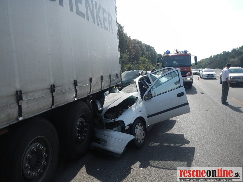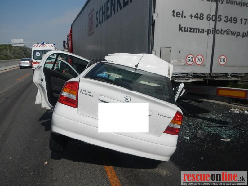 KRPZ Trnava | Pri včerajšej (22.8.) dopravnej nehode na diaľnici zahynula 55 ročná spolujazdkyňa. K dopravnej nehode došlo o 15.00 hod. na 46.km diaľnice D1 v smere od Bratislavy na Trnavu. Autobus idúci po diaľnici dostal defekt na ľavom prednom kolese, v dôsledku čoho zastavil v pravom jazdnom pruhu. Za autobusom sa pohyboval poľský kamión, ktorý ho pre hustú premávku nemohol obísť, preto zastavil za ním. Asi po dvoch minútach státia narazilo do ľavej zadnej časti kamiónu osobné auto Opel Astra. 55 ročná spolujazdkyňa z Hlohovca, časť Šulekovo, sediaca na prednom sedadle, utrpela zranenia, ktorým na mieste podľahla. 29 ročný vodič z tej istej obce a jeho 30 ročný spolujazdec z Vlčkoviec utrpeli ľahké zranenia a boli prevezení do nemocnice. Polícia alkohol u vodičov nezistila. Premávka na diaľnici bola obmedzená do jedného jazdného pruhu. Polícia začala trestné stíhanie pre usmrtenie.
