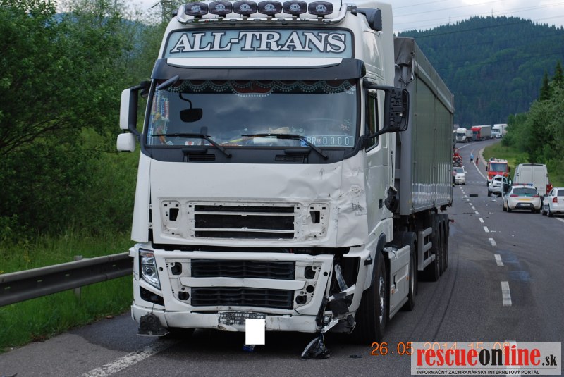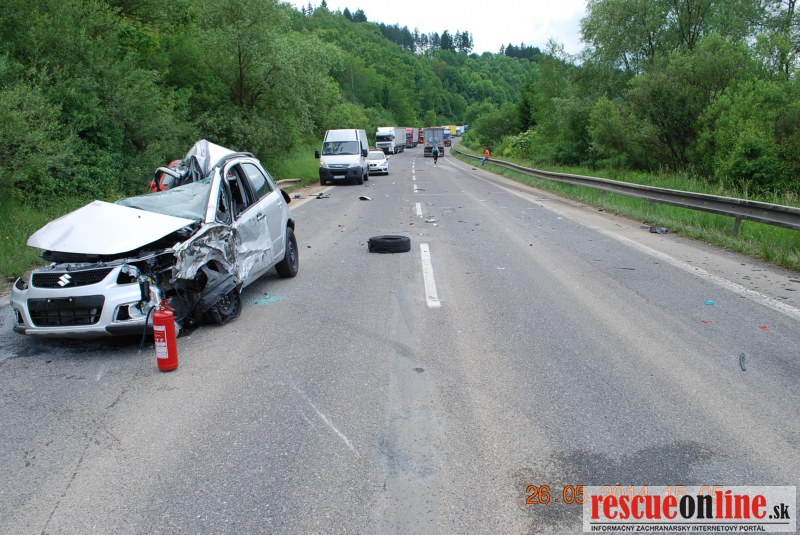 KRPZ Žilina |MM| K tragickej dopravnej nehode došlo v pondelok 26.mája o 14.30 hodine na ceste I/59 medzi Dolným Kubínom a obcou Kňažia. 46 ročný vodič jazdiaci na vozidle Suzuki SX4 jazdil smerom na obec Kňažia, keď v tiahlej ľavotočivej zákrute v miernom klesaní z kopca z doposiaľ nezistených príčin plynulo prešiel do protismeru, kde narazil do zadnej nápravy kamióna. Nárazom vozidlo Suzuki otočilo a došlo k ďalšej zrážke s druhým kamiónom jazdiacim v rovnakom smere ako kamión pred ním. Po druhom náraze vozidlo Suzuki odhodilo späť do pôvodného jazdného pruhu, pričom zozadu do neho narazilo vozidlo Ford Fusion, ktoré viedol 52 ročný vodič (občan Ruskej federácie).Pri dopravnej nehode na mieste zraneniam podľahol 46 ročný vodič Suzuki. S ľahkými zraneniami vyviazli vodič Ford a jeho spolujazdkyňa (49). Ostatní účastníci dopravnej nehody zranenia neutrpeli. Alkohol u vodičov zúčastnených na dopravnej nehode polícia nezistila, u vodiča Suzuki bola nariadená súdna pitva. Hmotná škoda na vozidlách je odhadnutá na cca 30.000,-€. Okolnosti dopravnej nehody vyšetruje polícia v Dolnom Kubíne.